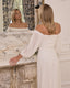 It features a boat neckline, with puffed chiffon sleeves gathered at the cuffs. The princess seams on the bodice and the fitted ruching at the hips enhance the figure, adding femininity to the bridal look.