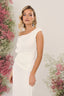 Ce design, confectionné en crêpe blanc, dégage féminité et élégance, fusionnant parfaitement des éléments classiques et contemporains dans une pièce intemporelle et sophistiquée. Son décolleté asymétrique, orné d'une délicate bretelle superposée, et sa ceinture drapée qui descend de la taille jusqu'à la hanche, subliment impeccablement la silhouette. La jupe droite, avec une fermeture éclair dans le dos, offre confort et liberté de mouvement.