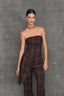 Traje Evento Oxford Estampado Glen Marrón Tres Piezas Total Look chaqueta top asimétrico pantalón largo top frontal