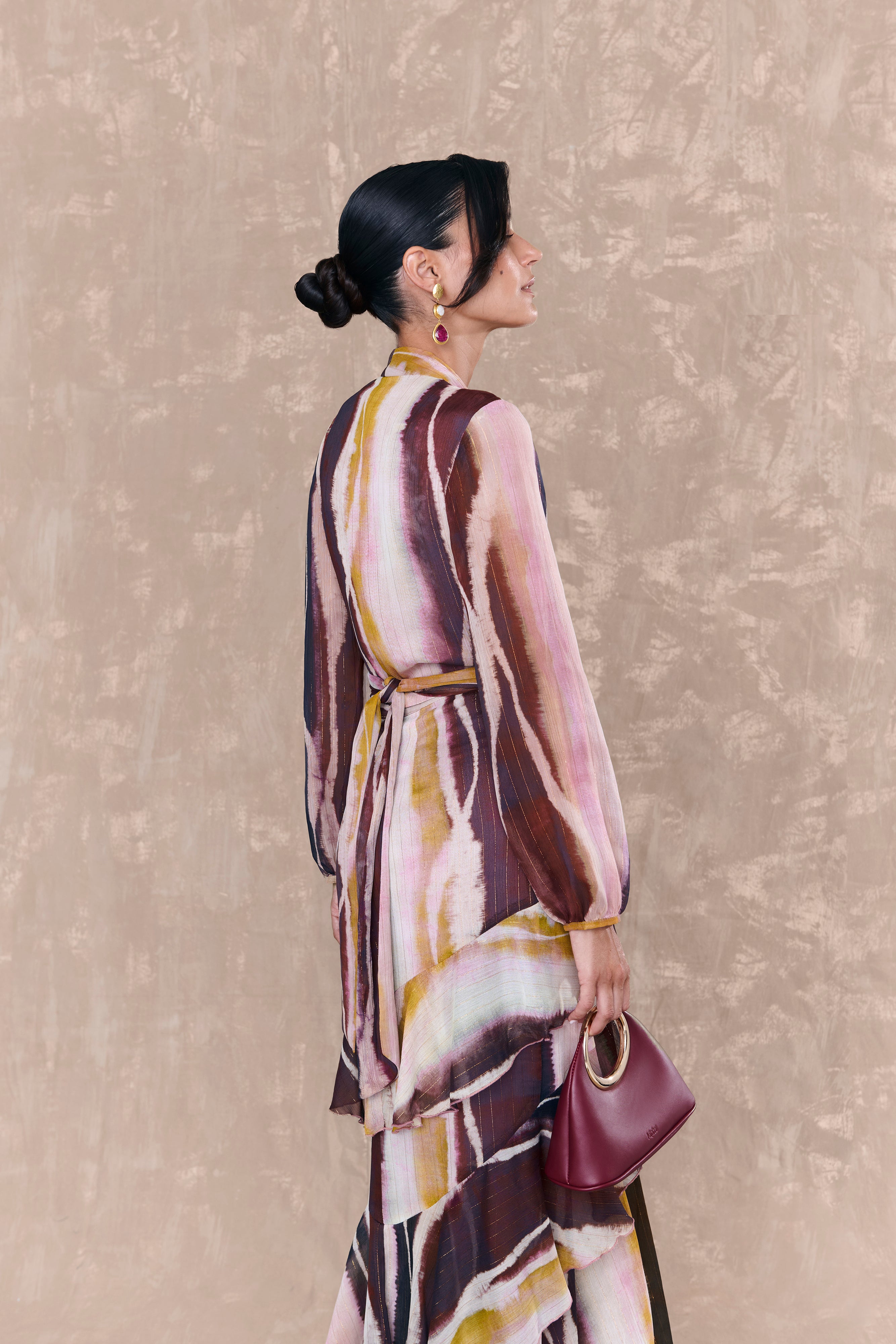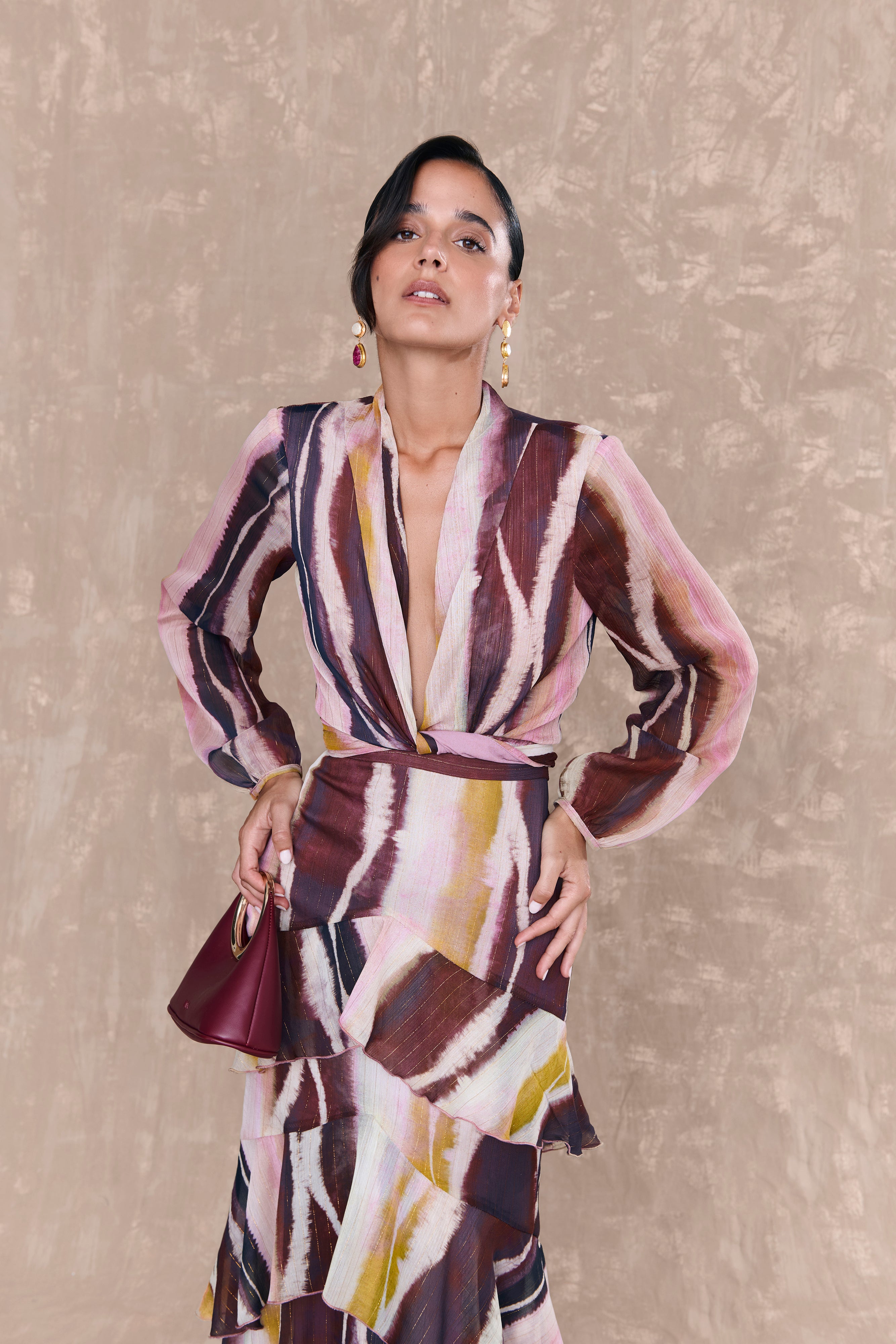 It features long, puffed sleeves with elastic cuffs, adding volume and movement to the design. The print in shades of dusty pink, wine, mustard, off-white, and mink creates a warm, versatile, and sophisticated palette, ideal for both day and night looks.