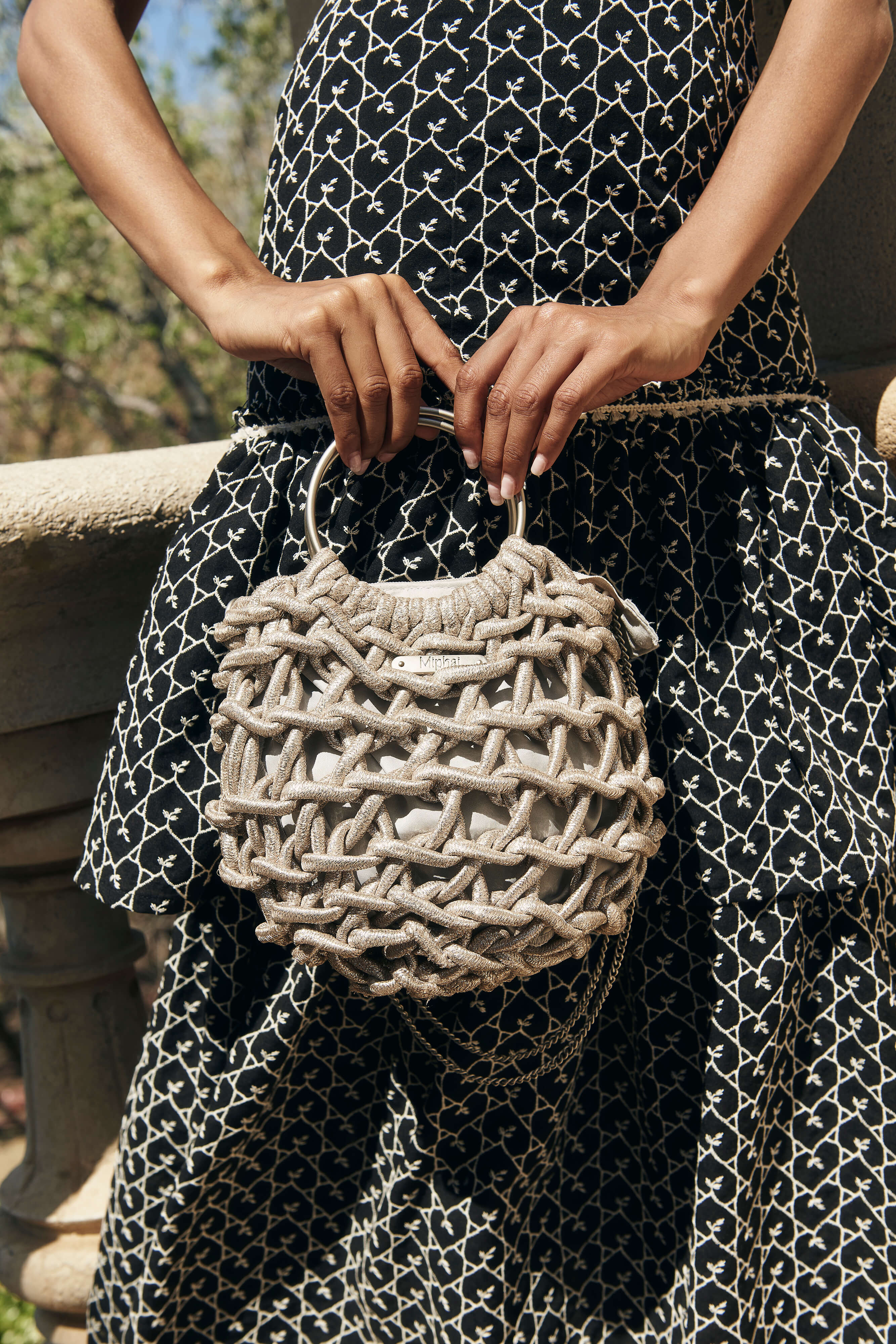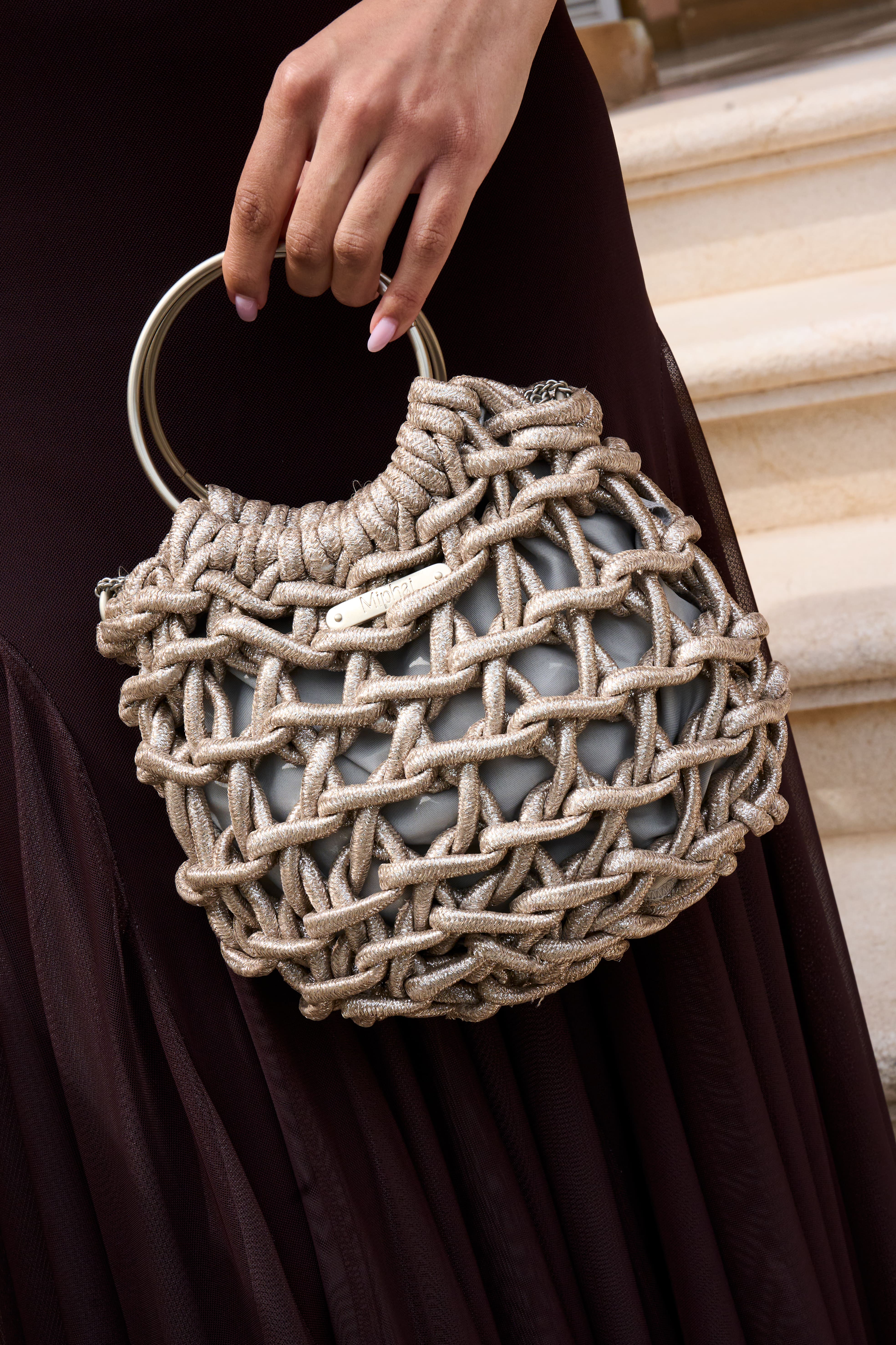 This exclusive bag stands out for its sack-like design with a structure of hand-woven silver cords , creating a striking mesh that envelops a neutral-toned interior, providing texture and contrast. Its rounded shape and soft base give it a relaxed feel, perfect for any occasion.