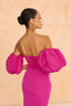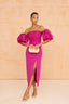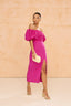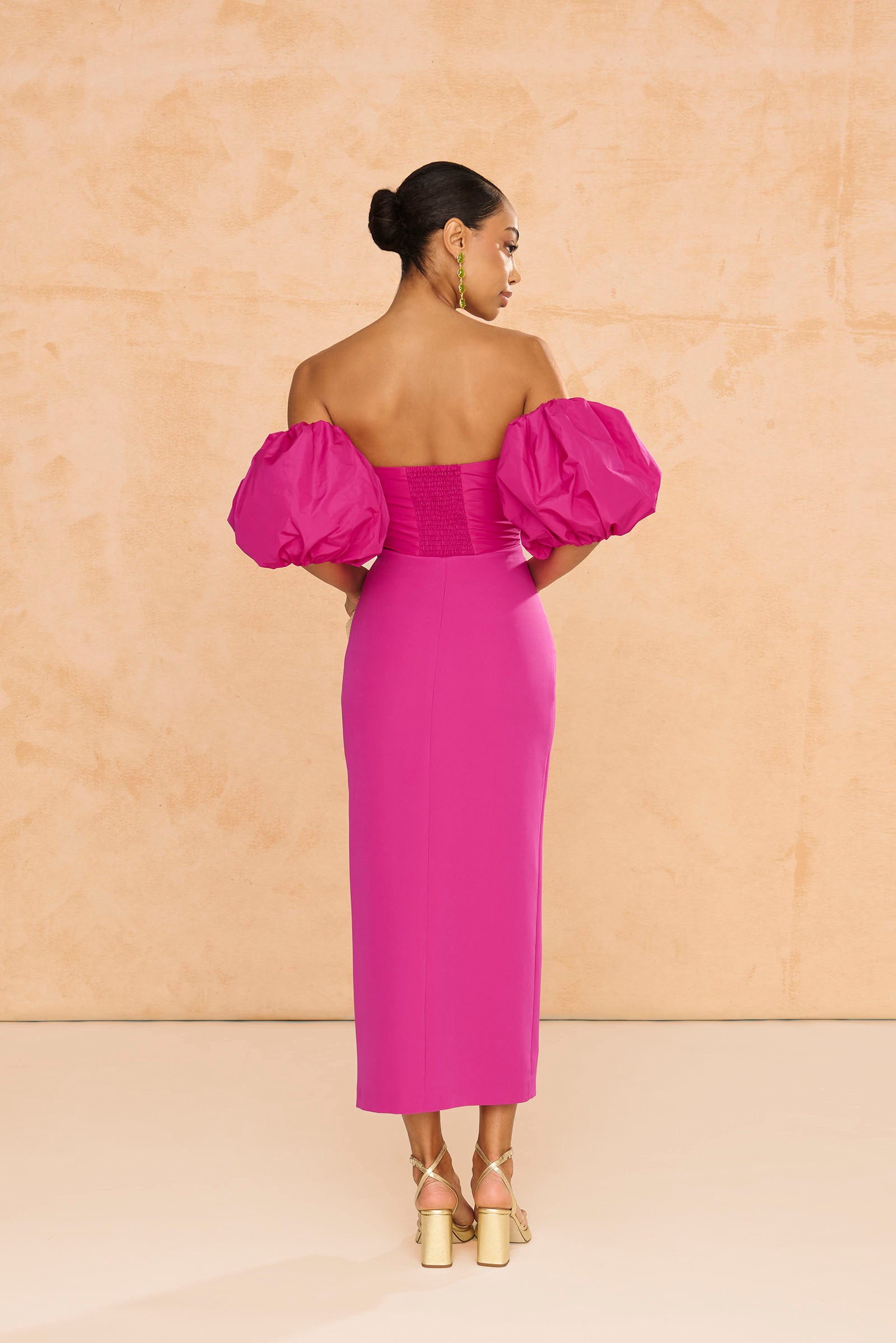 This model is made of Fuchsia taffeta and features a flattering midi cut, perfect for standing out at any event .