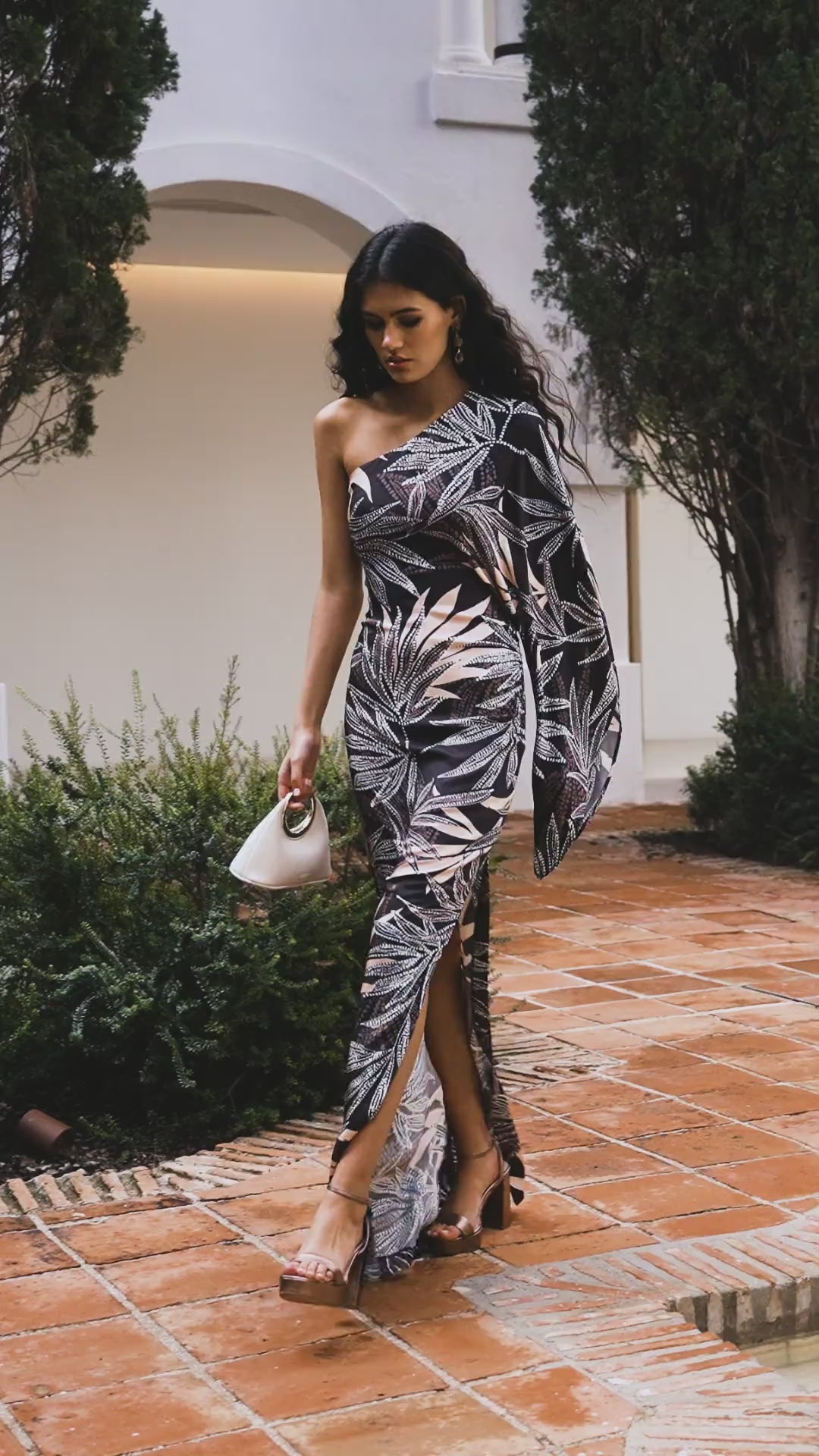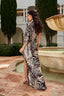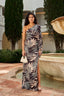 Discover our stunning Olalla Asymmetric Long Dress in Brown Print.