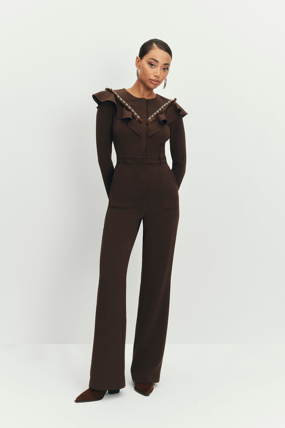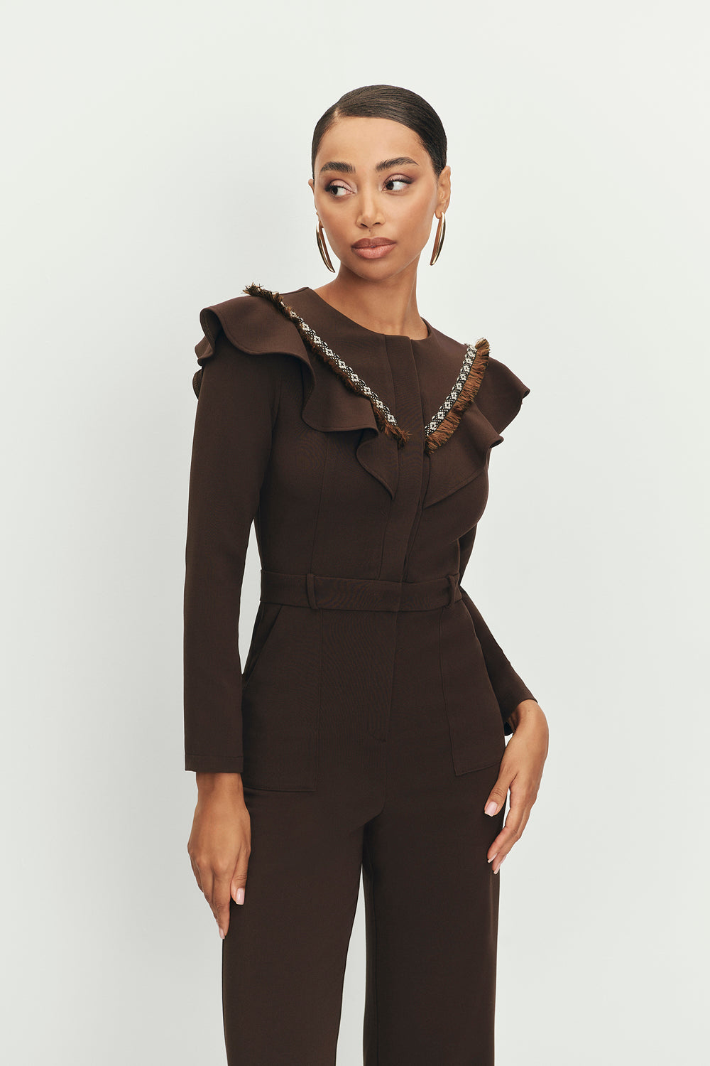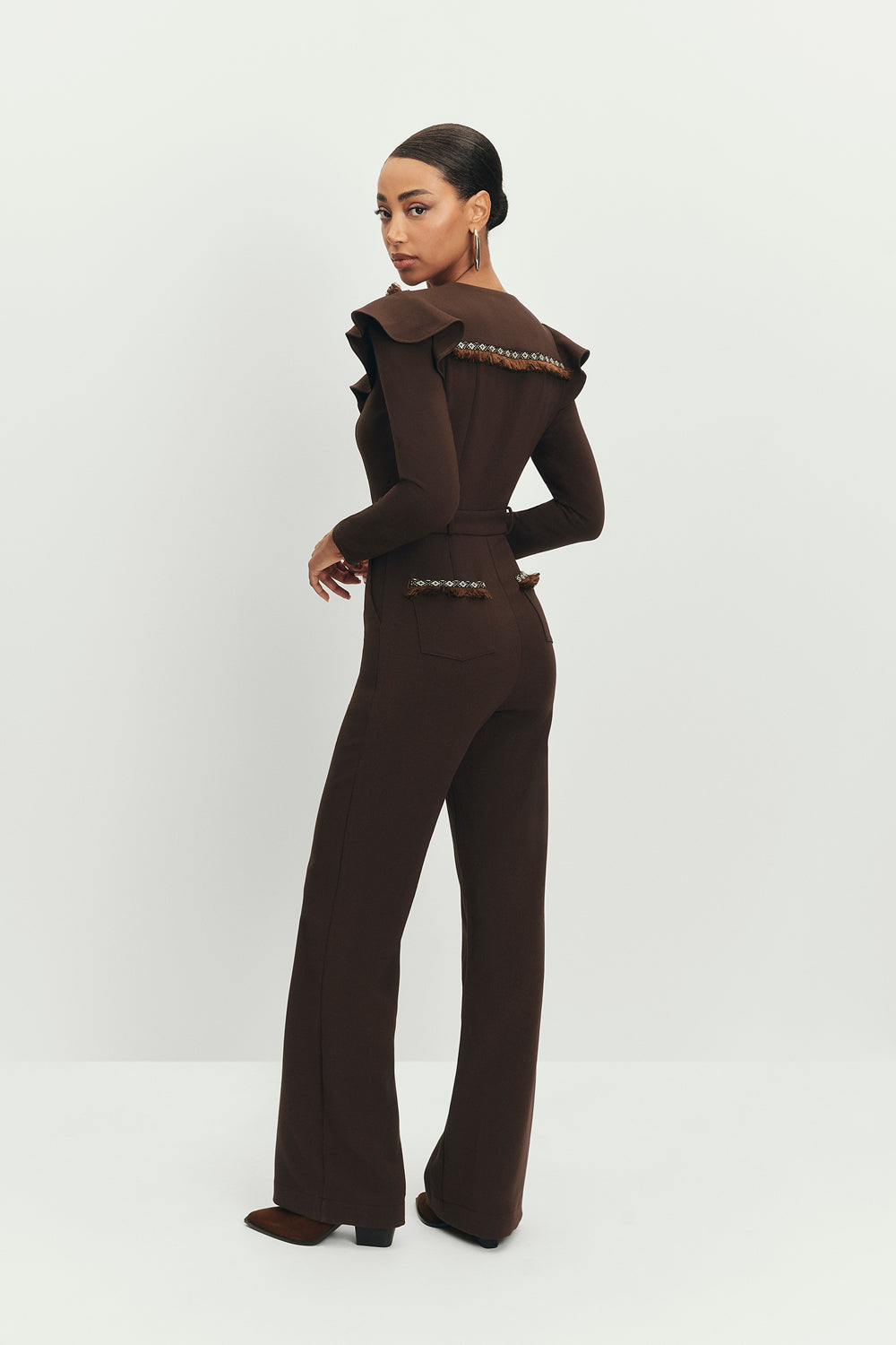 The Eter Jumpsuit is one of those jewels designed to leave no one indifferent, a perfect fusion of sophistication and originality . Its strength lies in its stunning ruffled maxi collar , which masterfully frames the neckline and is adorned with exquisite embroidered trimmings with subtle fringes and beads.