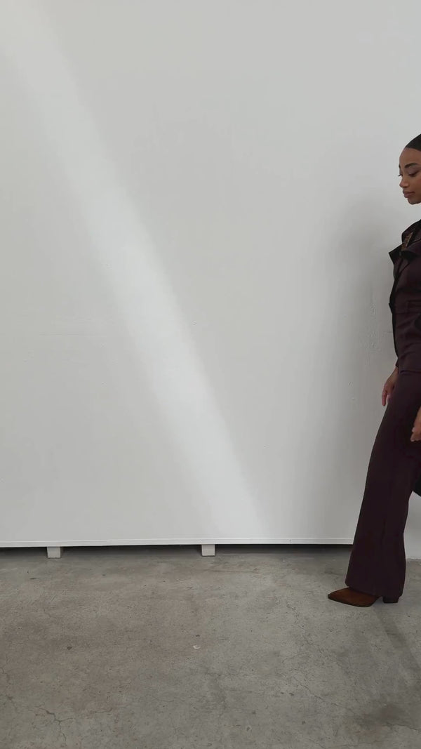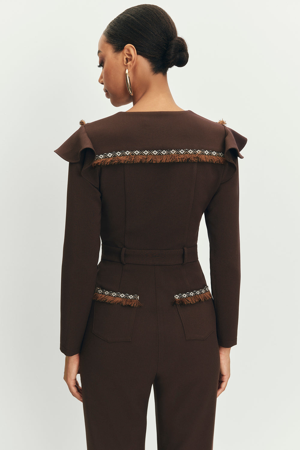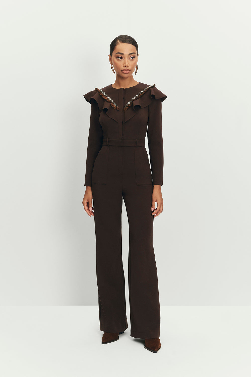 The Eter Jumpsuit is one of those jewels designed to leave no one indifferent, a perfect fusion of sophistication and originality . Its strength lies in its stunning ruffled maxi collar , which masterfully frames the neckline and is adorned with exquisite embroidered trimmings with subtle fringes and beads.