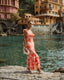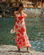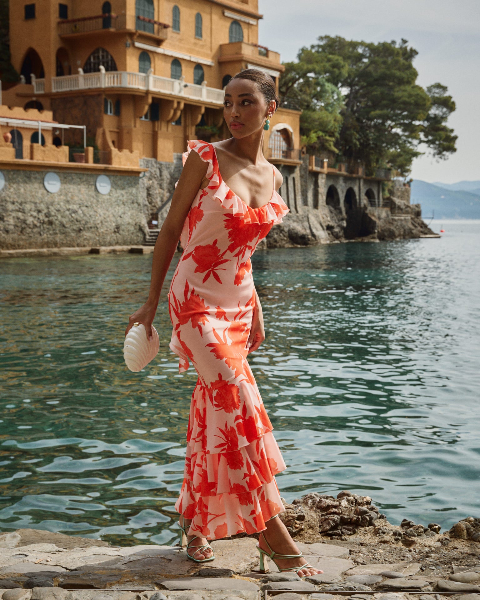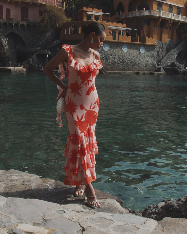 Look spectacular with our Hanna Naranja , a long dress made of floral printed chiffon . Its most special detail is undoubtedly its ruffles both at the bottom and on the straps.