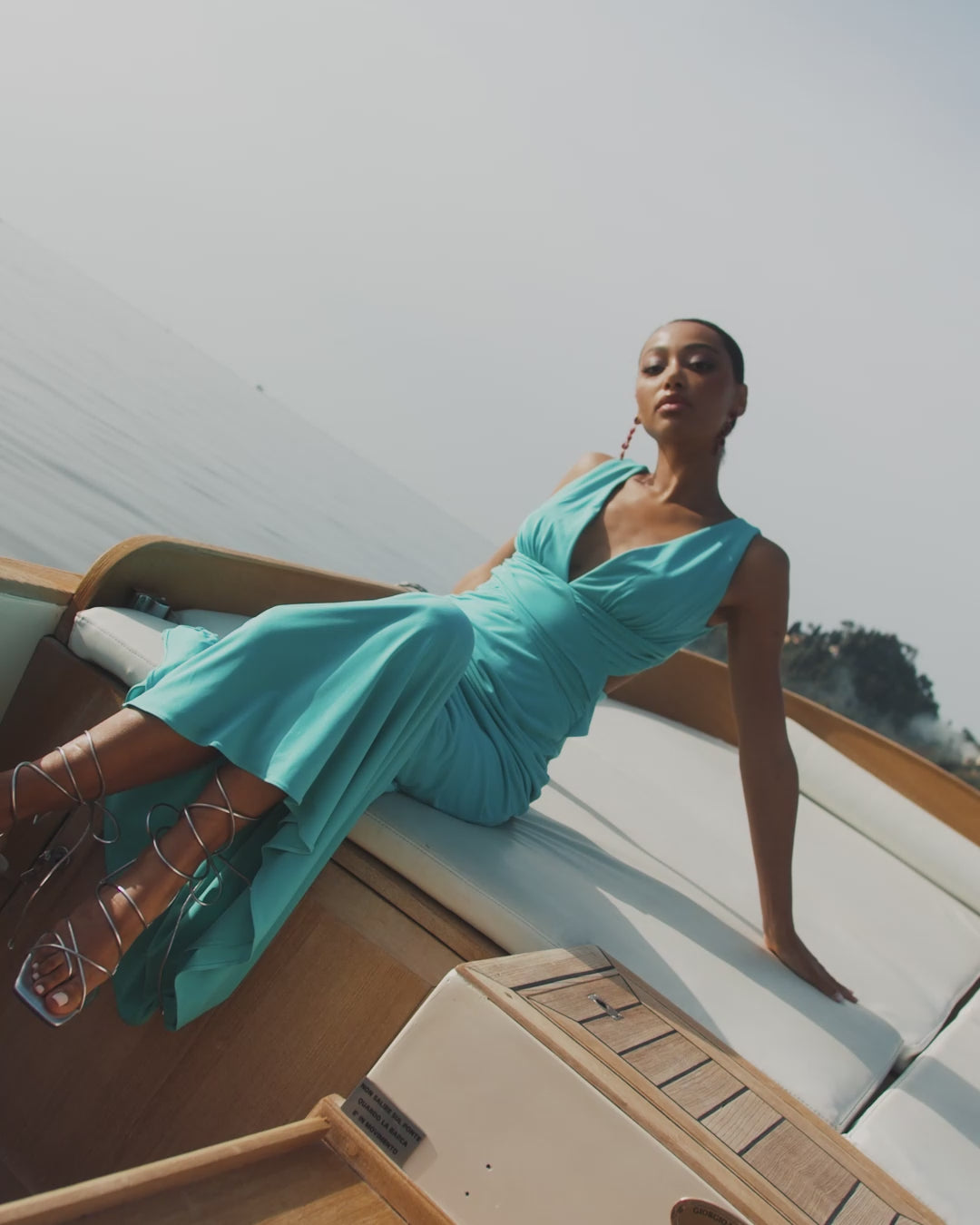 We welcome our turquoise Nicole dress . This spectacular long silk knit dress will fit your body perfectly. With her impressive neckline and spectacular cross back will not leave anyone indifferent.