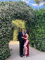 Vestido largo granate con escote palabra de honor, volante lateral, drapeado lateral y abertura