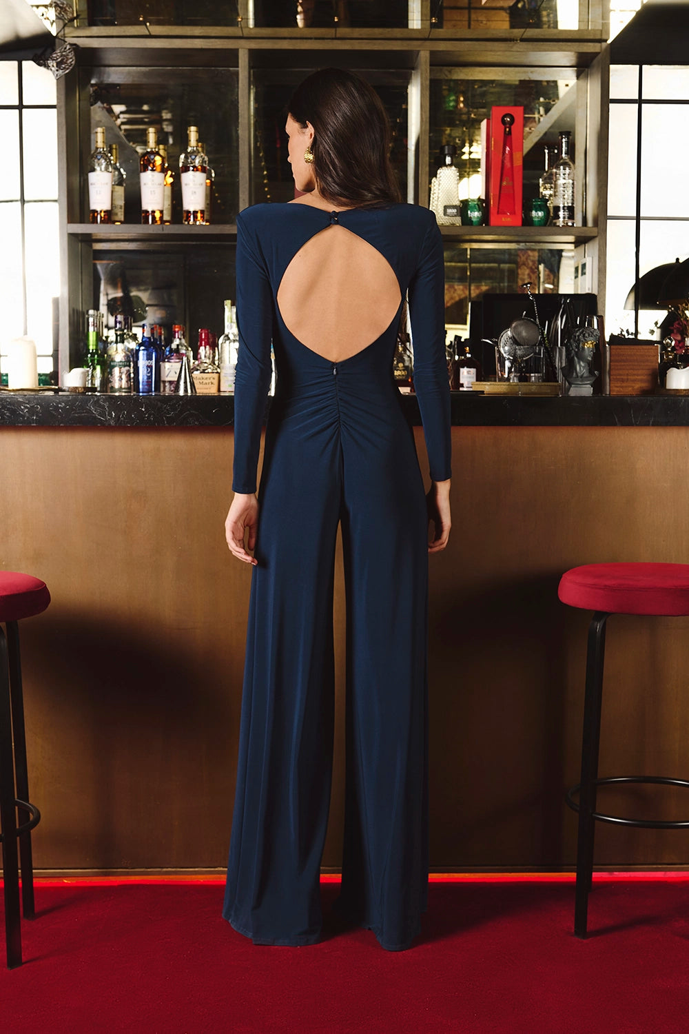 Discover the Navy Blue Enigma Jumpsuit , the piece that transforms sophistication into pure movement. This design has been conceived to envelop you in a timeless elegance that speaks for itself. The fabric of elastic knit With an exceptional fluid drape, it caresses your silhouette with sublime support, ensuring comfort without sacrificing shape.