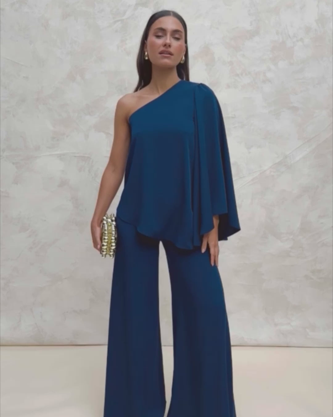 Blusa Triana Marino Lisa Asimétrica Manga Ancha Fiesta Evento Invitada Principal