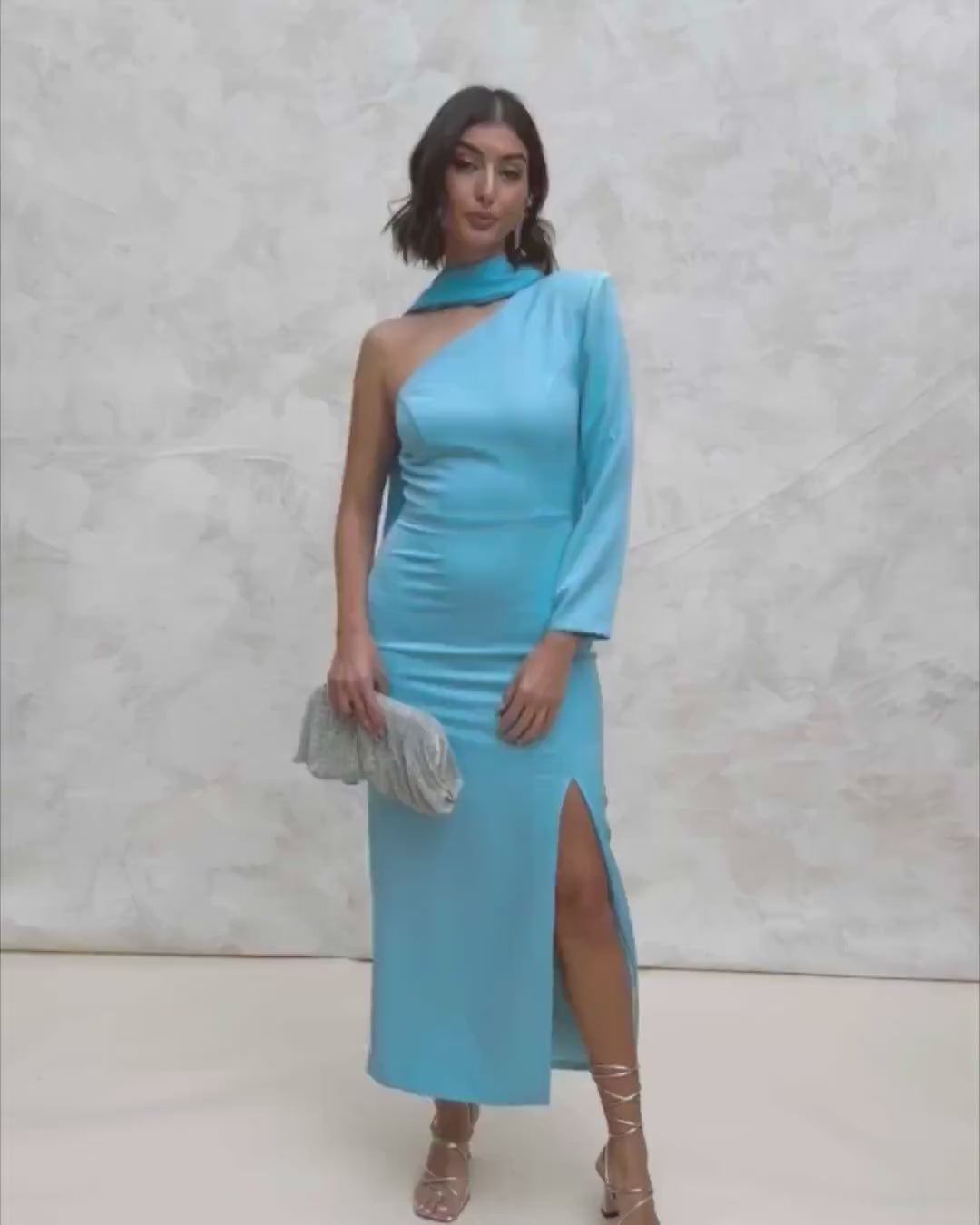 I'm Chiara , an asymmetrical dress made in blue and I'm very trendy . Also, my design with a single sleeve , you will love it. I also have an elegant shoulder pad, They will highlight your silhouette .