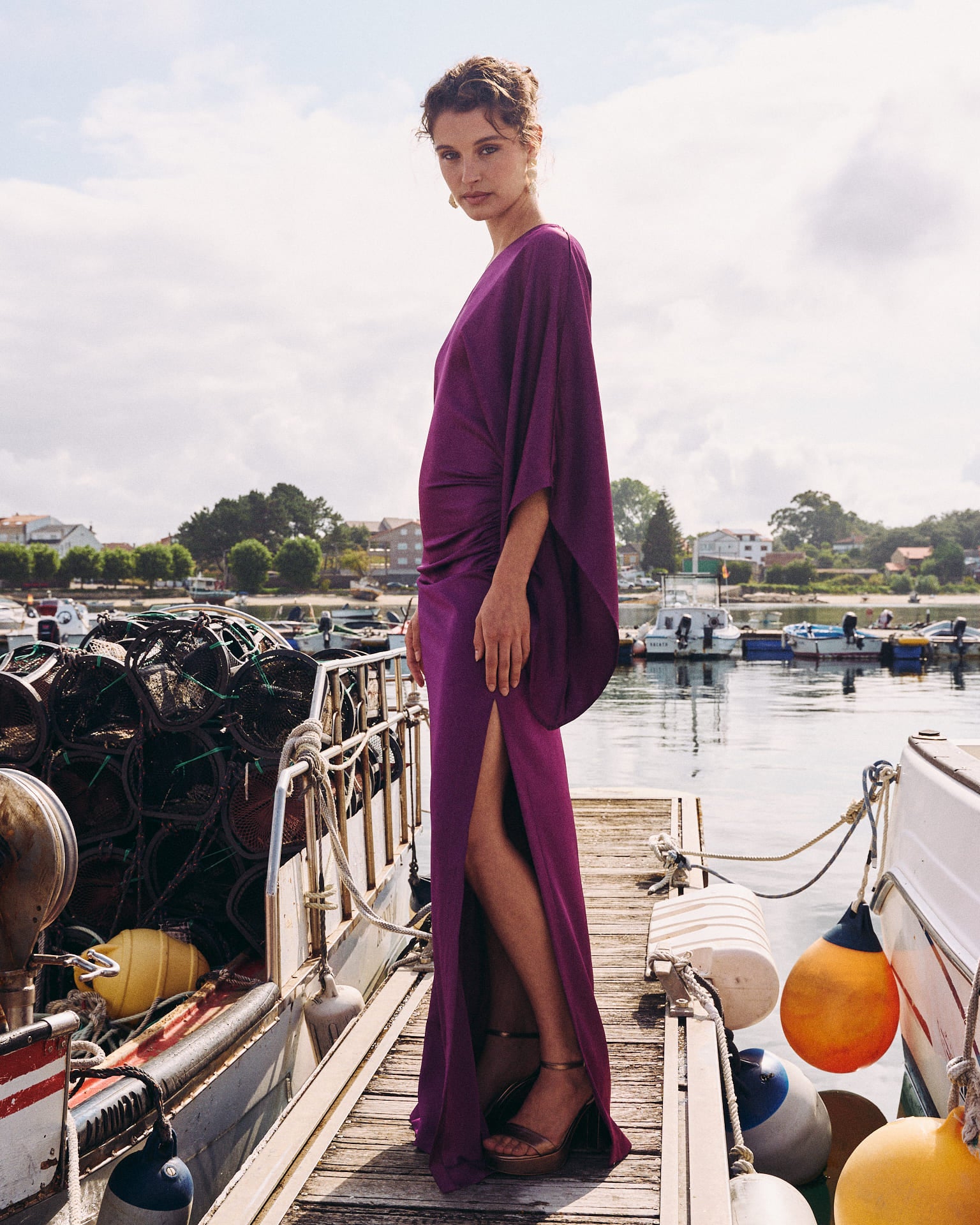 Its asymmetrical batwing sleeve gives it a delicate touch, while the ruching at the hip and its pronounced side slit enhance the silhouette, creating an exceptional balance between sophistication and daring.