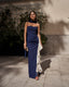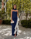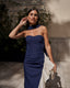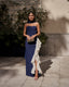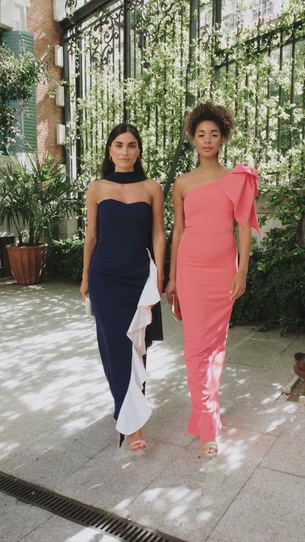 I am Macarena, a long dress, made in navy blue crepe that will not leave anyone indifferent. Plus, I'm fully lined and don't wrinkle. The strapless neckline design will highlight your silhouette . It provides so much added value, such as volume and style, its side flounce of the same color on the left side.