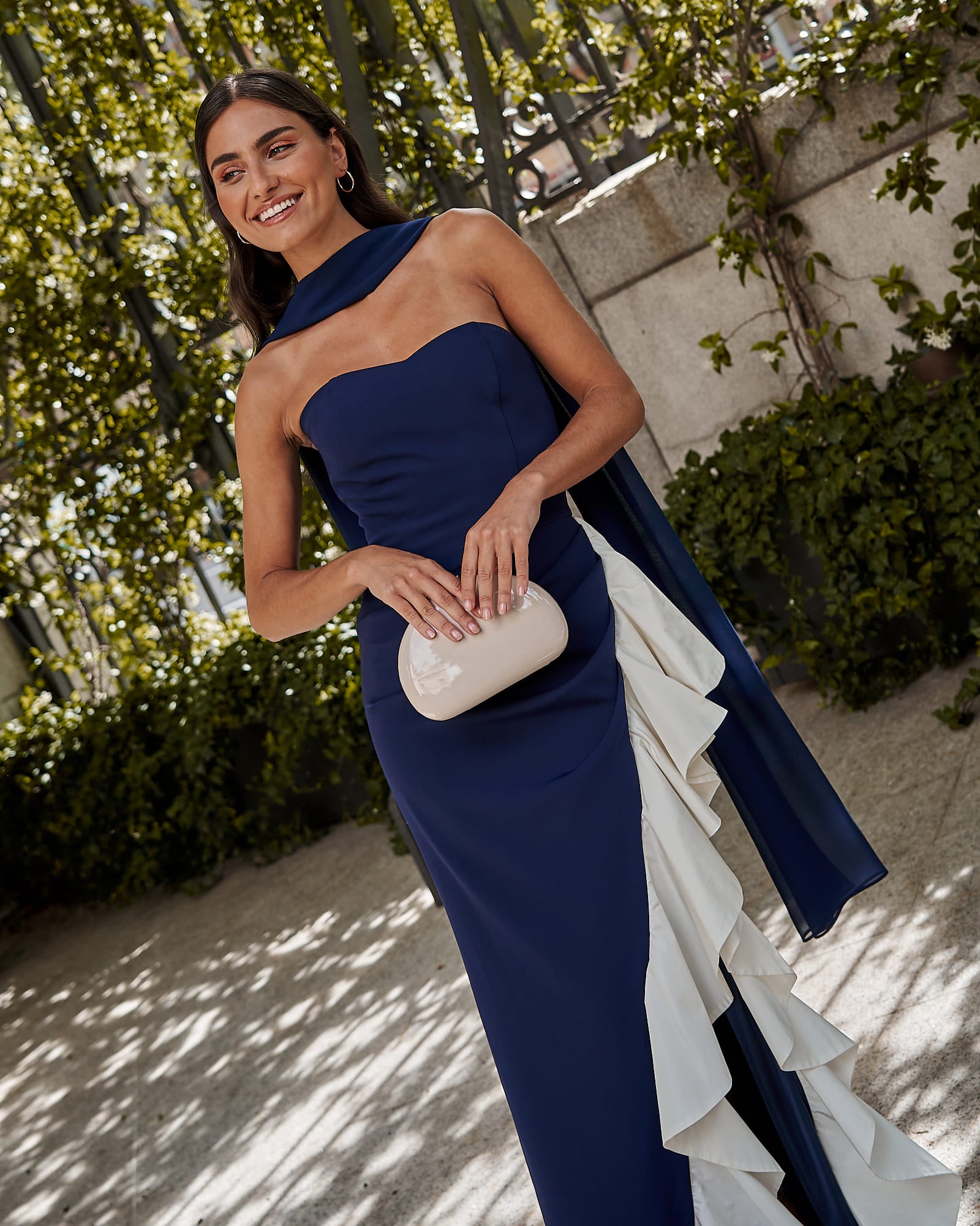 Vestido Macarena Marino Invitada Palabra de Honor Volante Lateral Blanco Miphai