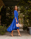 This dress is available in navy blue, electric blue, red, and fuchsia.