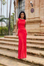 Descubre nuestro vestido Largo Carmela, confeccionado en punto de seda rojo, una opción perfecta para deslumbrar en cualquier ocasión especial.