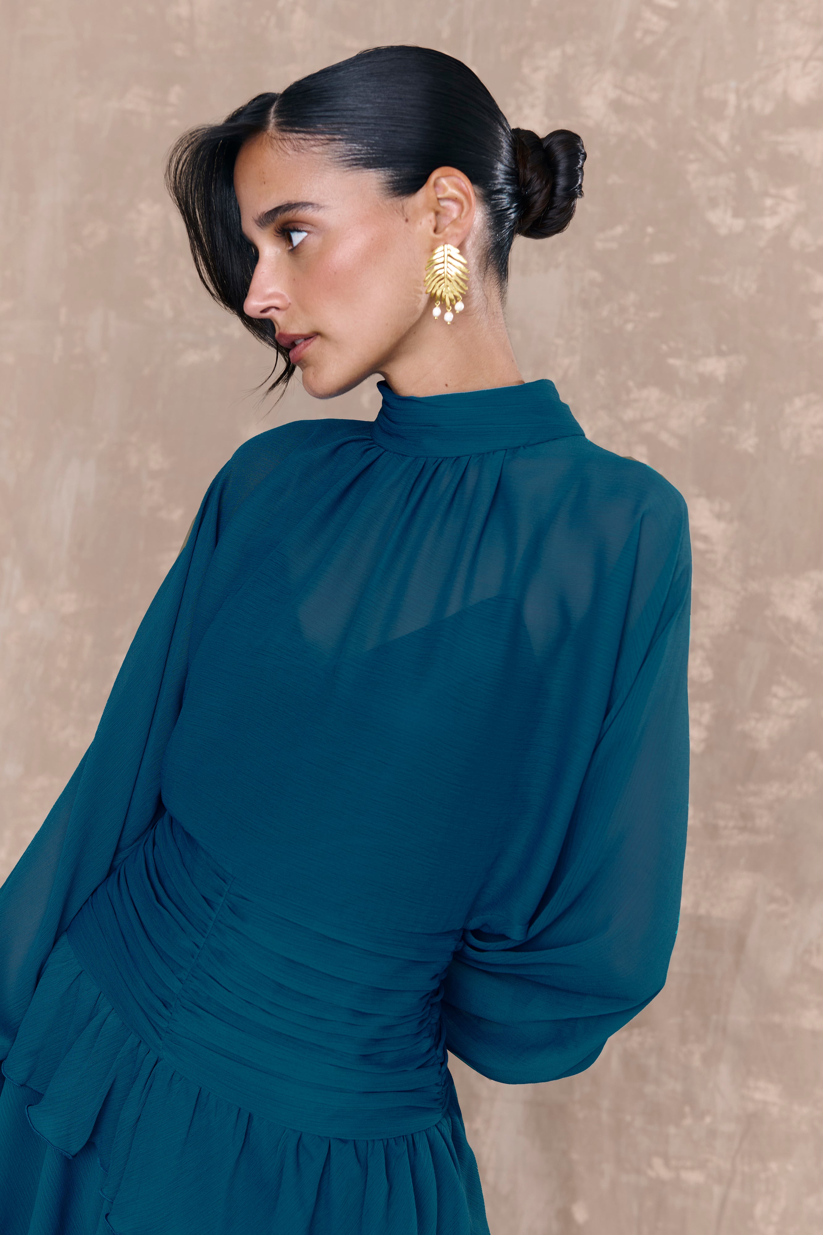 Las mangas largas abullonadas, terminadas en puño elástico, equilibran el volumen con elegancia. Debajo de la gasa, Emilie cuenta con un vestido interior de punto que garantiza comodidad y opacidad. El cierre trasero con cremallera invisible asegura un ajuste impecable.