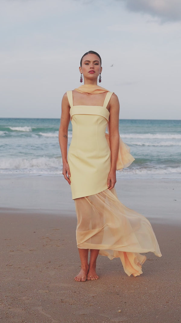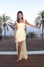 Descubre nuestro Vestido Ámbar Amarillo en crepé, opción perfecta para las más atrevidas.