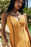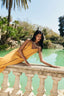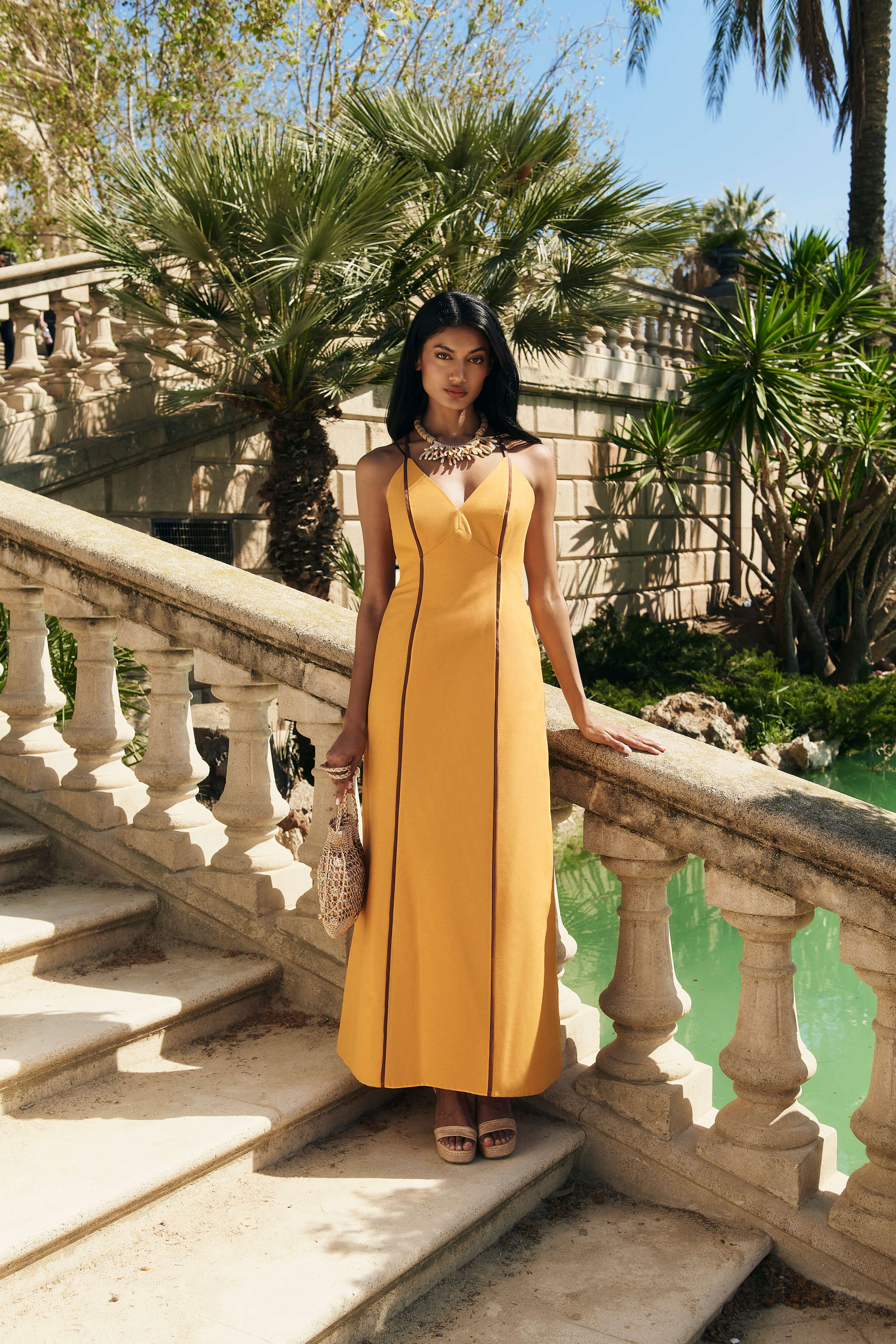 Os presentamos nuestro espectacular Vestido Capri Largo en color mostaza con detalles en marrón chocolate.