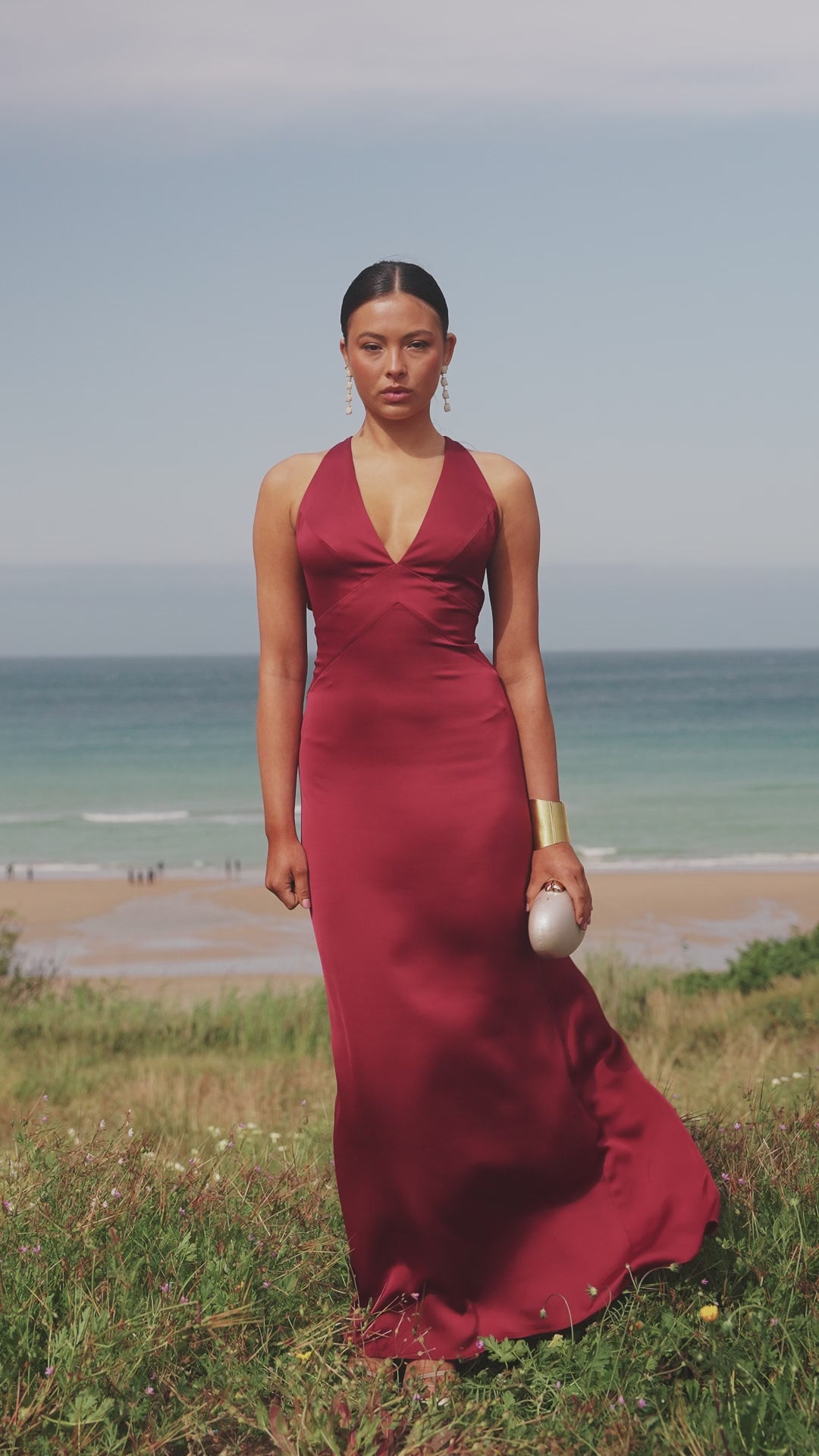 Descubre nuestro Vestido Largo Lina confeccionado en Satén granate.