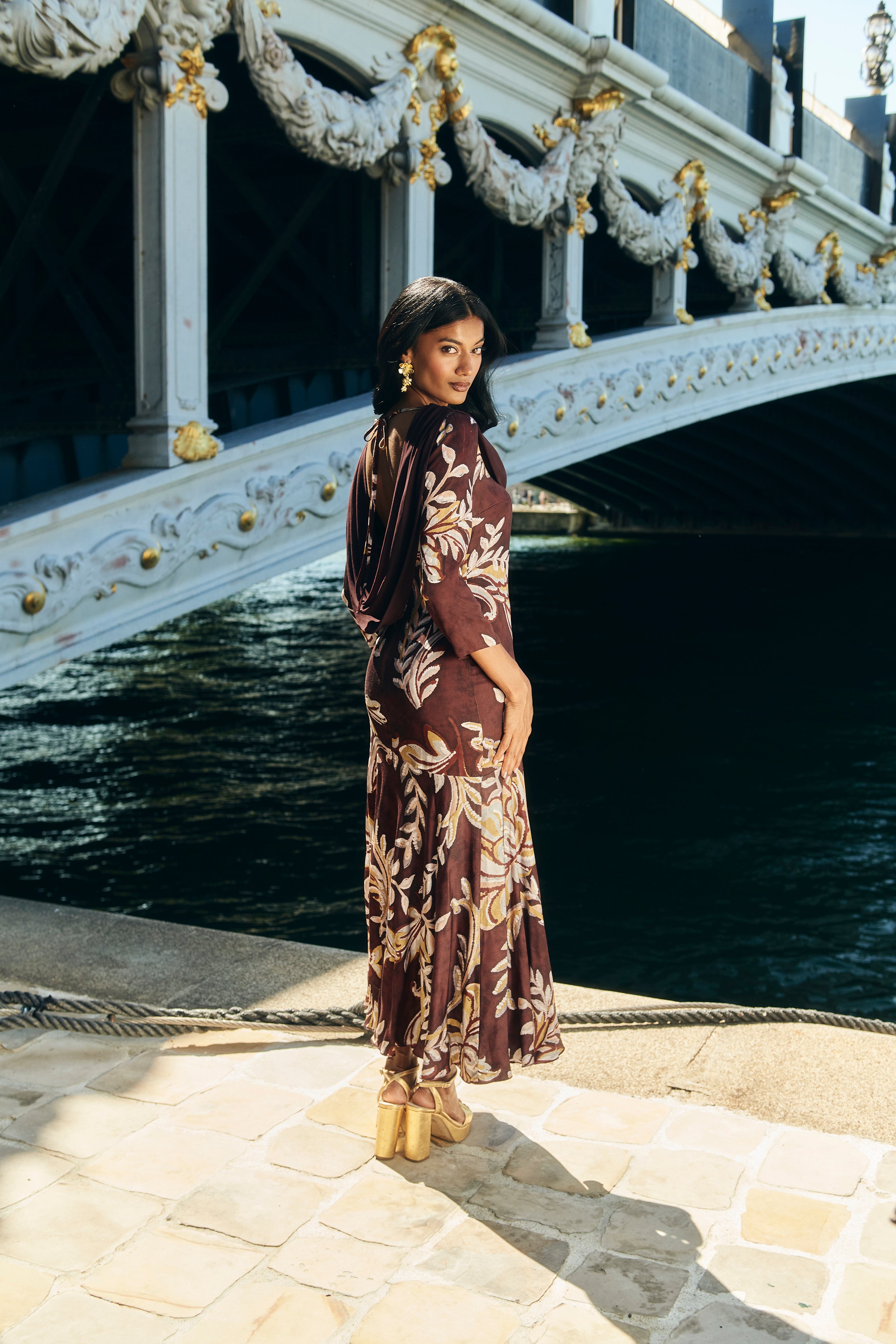 El vestido destaca especialmente por su espalda abierta, adornada con un drapeado superpuesto en gasa que añade volumen y movimiento de manera sutil. Este mismo detalle de cuello drapeado en tono burdeos enmarca el escote delantero, aportando contraste y un acabado distintivo y elegante.