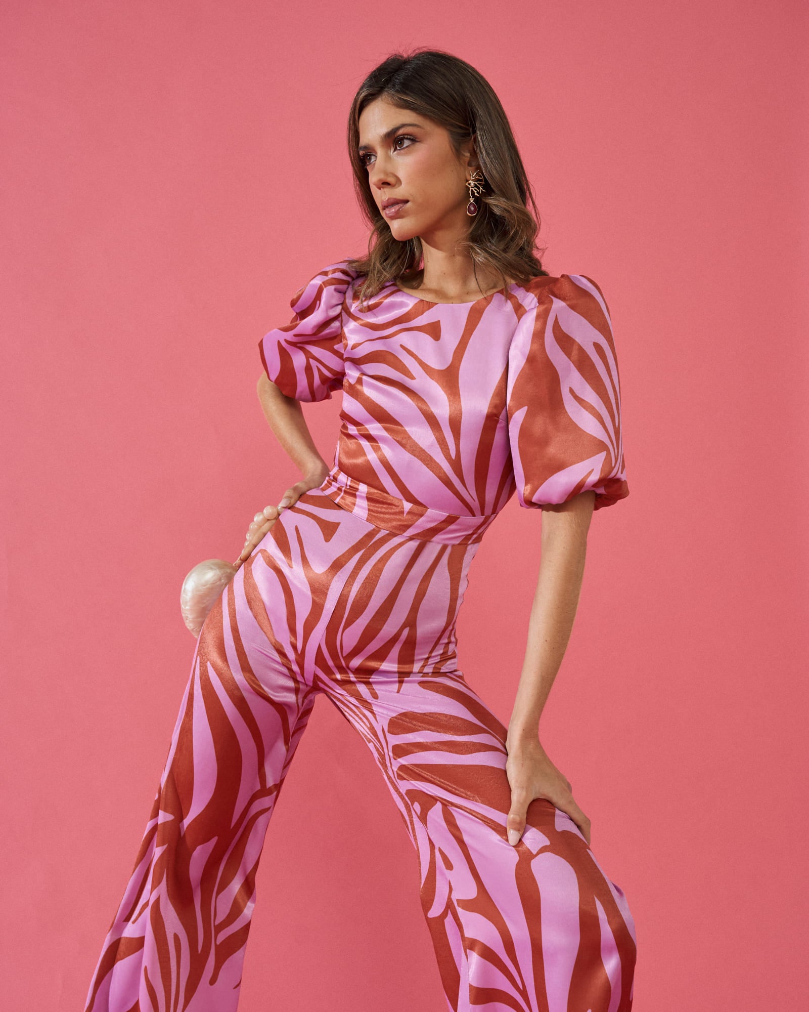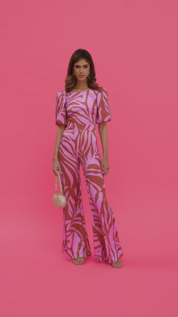 Soy Sol, un mono confeccionado en crepe estampado cebra Además, mi diseño con escote en la espalda, botones forrados y mangas abullonadas te encantará. También tengo pantalón pata de elefante, te resaltará la silueta.