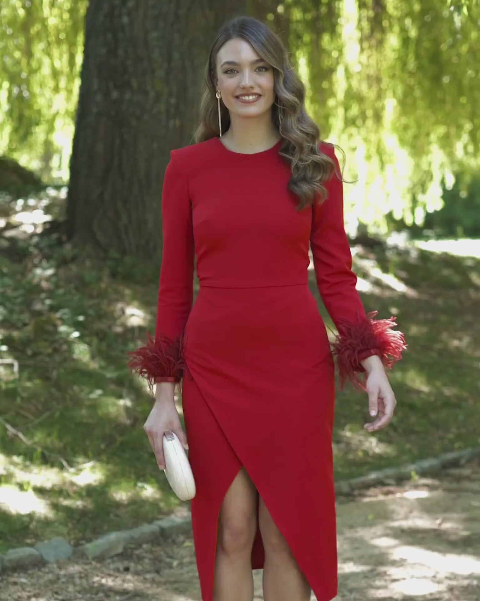 Soy Carmen, un vestido confeccionado en color rojo y soy muy glamuroso. Además mi diseño midi con plumas de avestruz de quita y pon en el mismo color en mangas y abertura en la pierna, te encantará. También tengo manga larga, te resaltará la silueta