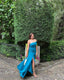 Vestido Cumbia Turquesa elegante con escote asimétrico, ideal para bodas y eventos especiales