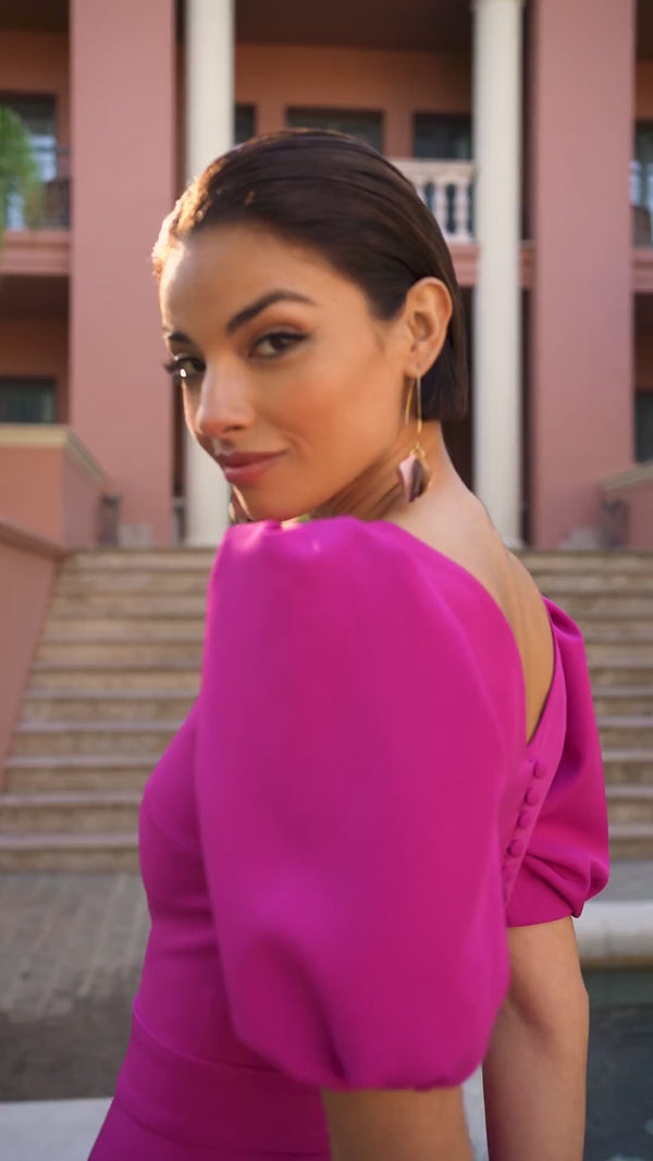 .Soy Sol, un espectacular vestido midi confeccionado en crepe con mucha personalidad. Mi falda tiene un gran volante que aporta mucho vuelo al caminar y bailar. En la parte superior destaca el escote de mi espalda. También salta a la vista las grandes mangas abullonadas ¡es impresionante!