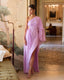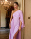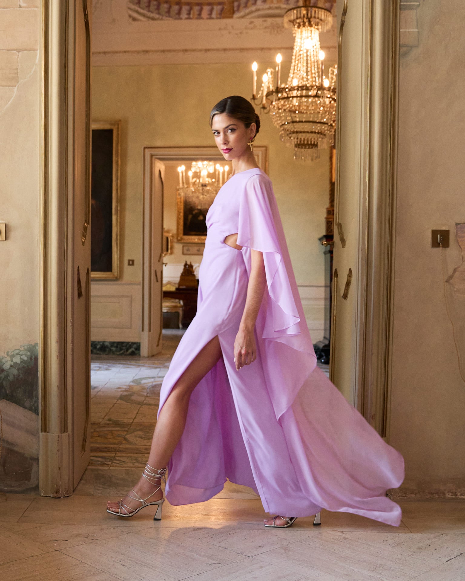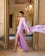 Nuestro vestido largo Valentina es sin duda una de las piezas más elegantes y sofisticadas de la colección. Está confeccionado en crepe y gasa en color malva con una abertura en la pierna. El vestido tiene un escote asimétrico y otra abertura en el costado que resaltará tu silueta. Su detalle más especial es la manga de murciélago en gasa del mismo tono.
