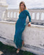 Descubre nuestro espectacular vestido midi asimétrico Xulia turquesa confeccionado en viscosa.