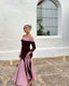 Este espectacular crop top de manga larga, es parte del set Gia compuesto de top y falda, confeccionado en punto de seda de alta calidad. Este top destaca por su cuello barco en gasa de color rosa.