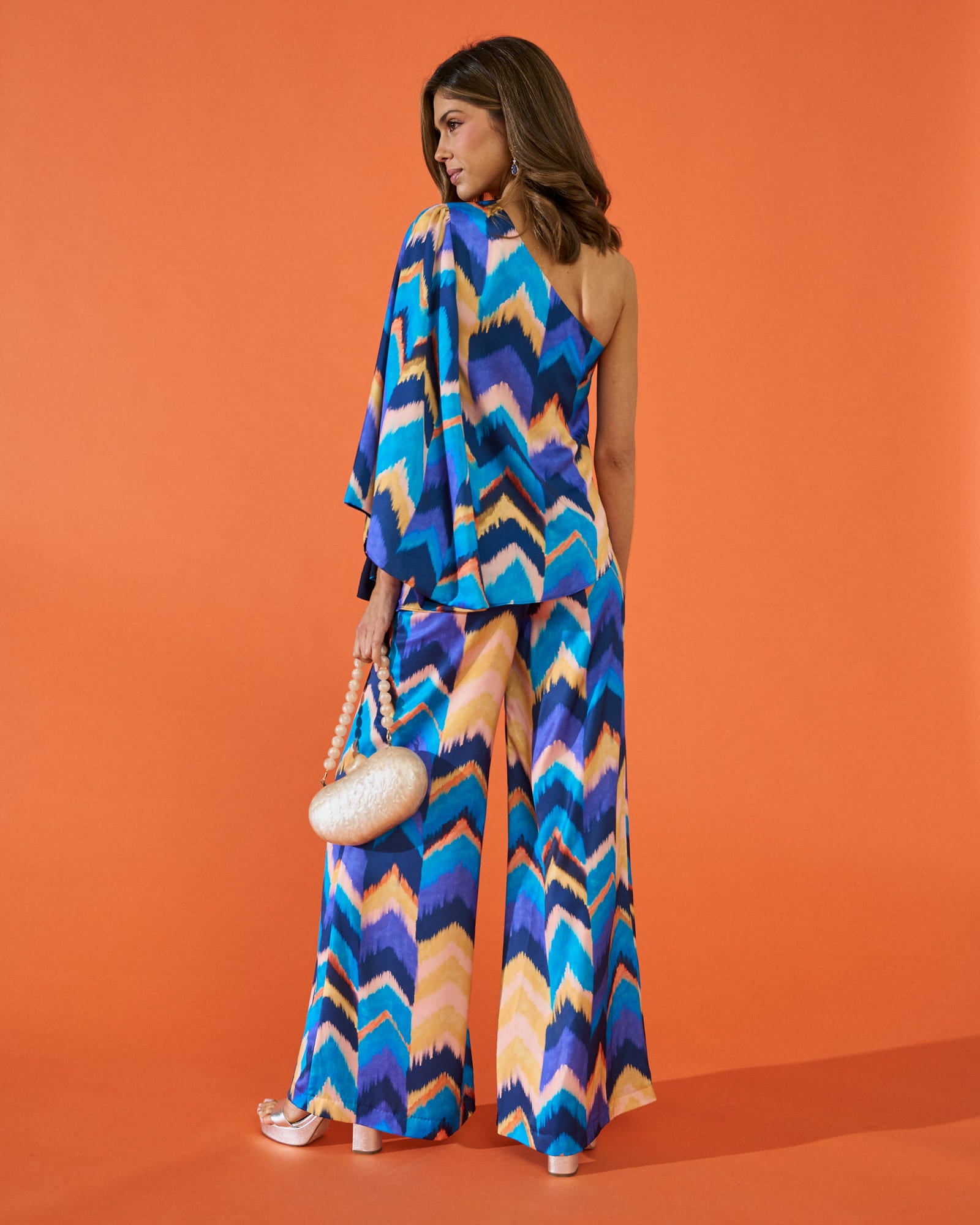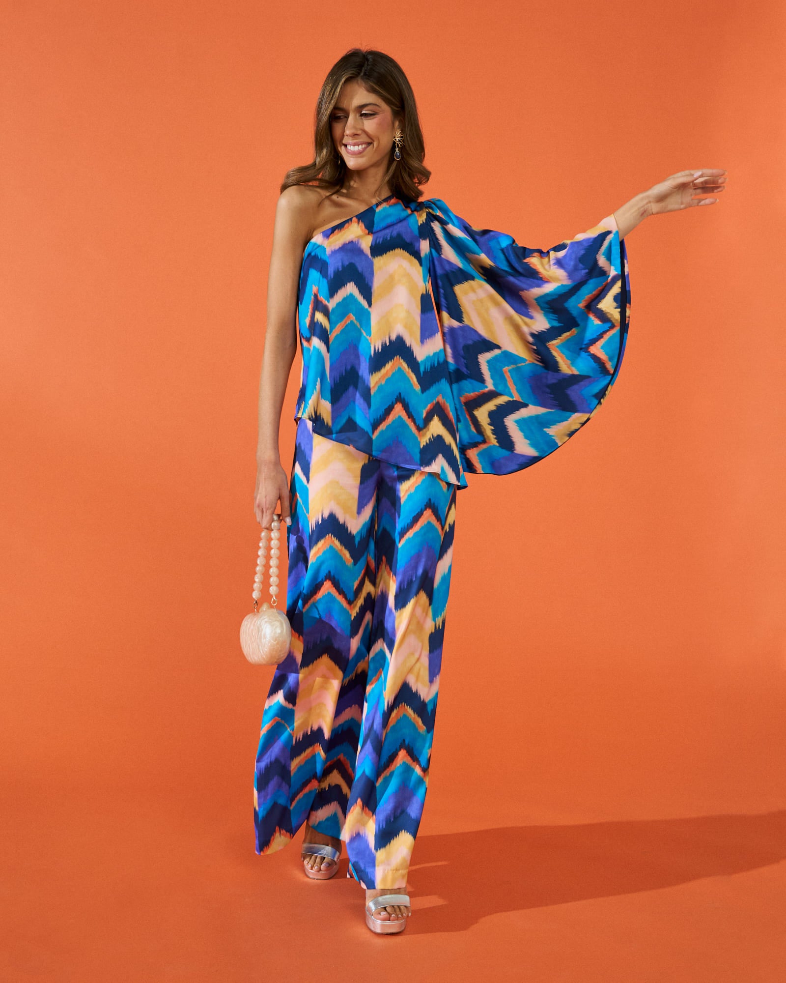Soy Triana, una blusa asimétrica confeccionada en crepe de estampado étnico y no dejaré a nadie indiferente. Además, mi diseño con una única manga acampanada, te resaltará la silueta