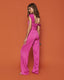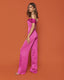 ¡Os presentamos a nuestro Mono Reme! Una prenda confeccionada en crepe rosa fucsia. Además, su diseño cuenta con un escote bardot con nudo en el pecho espectacular. También tiene un pantalón de pata elefante que estilizará tu silueta.