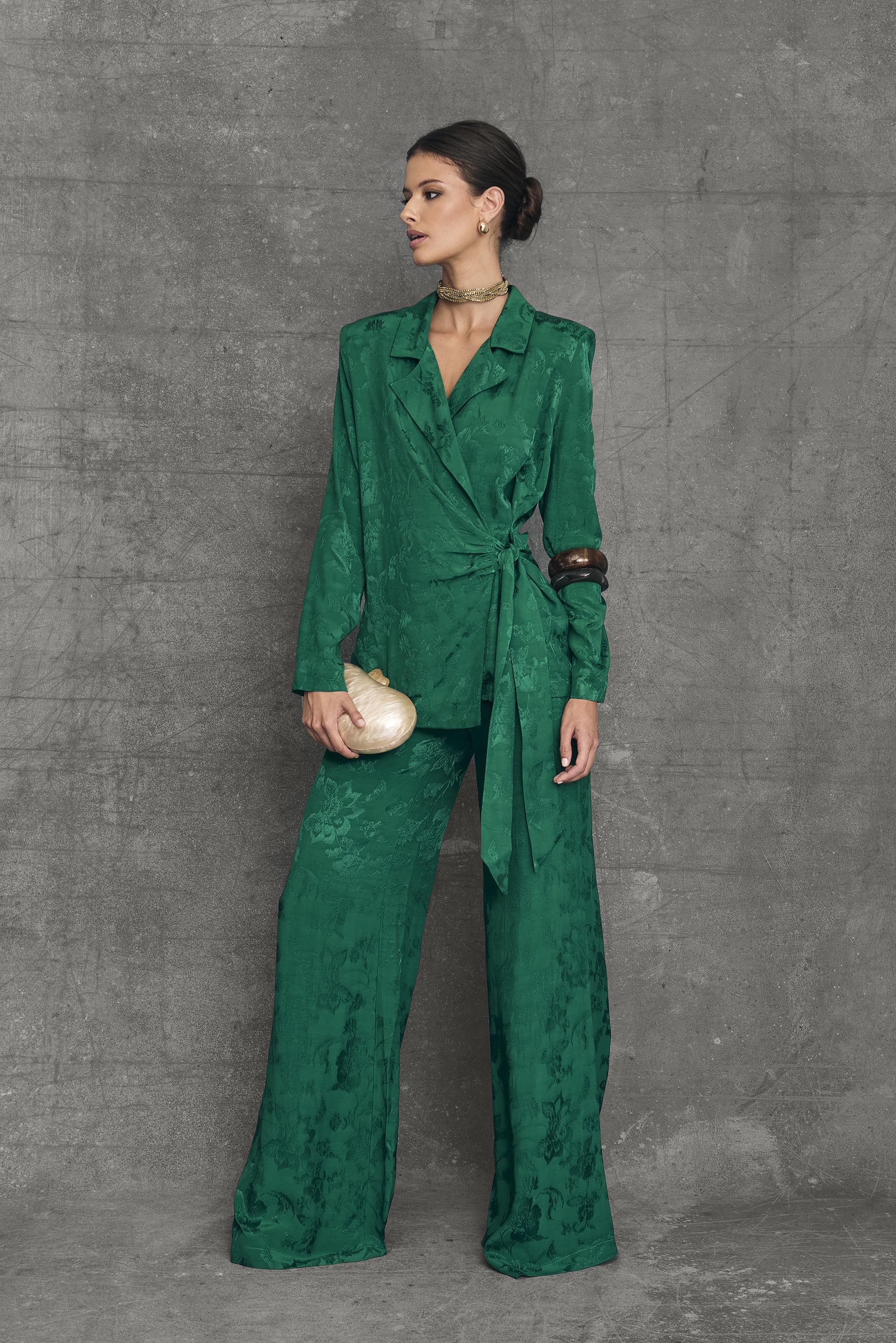 Este conjunto de dos piezasblazer y pantalón— captura la esencia de un traje, pero con la ligereza y fluidez que le otorga la viscosa con estampado Jacquard del que está compuesto.