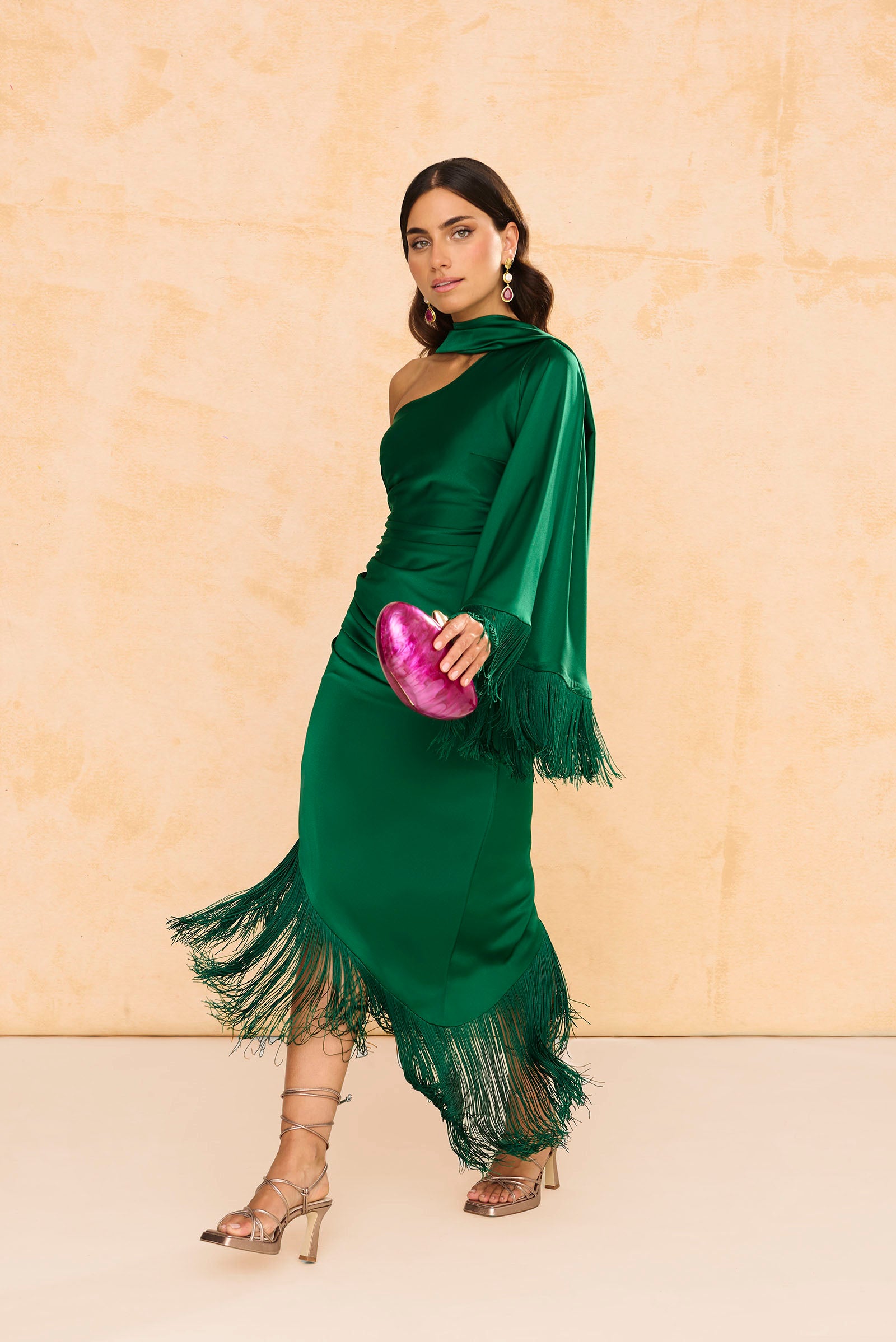Confeccionado en crepé de satén . Su diseño se caracteriza por un elegante escote y falda asimétrica, mientras que los flecos, presentes en la manga y el bajo, añaden un toque de dinamismo con cada paso. Incluye un chal de flecos que puede llevarse a modo de fular, aportando un detalle femenino y cómodo al look.