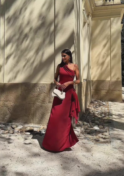 De silueta recta y corte maxi sobre tejido raso de caída perfecta, el vestido se sostiene sobre un fino tirante en el hombro izquierdo mientras que del hombro derecho nace una amplia cinta de gasa translúcida que se drapea en diagonal hacia el frente cubriendo el pecho con pliegues naturales aportando naturalidad y fluidez, para después cruzar la espalda completamente al descubierto y descender hasta el bajo como una estola.