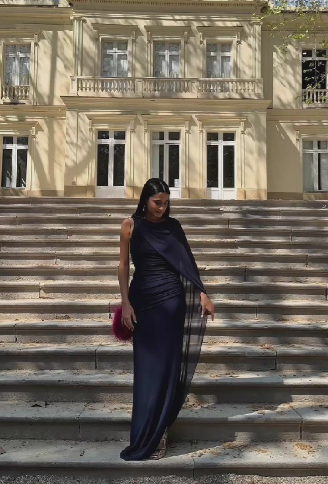 El cuello redondo limpio y los tirantes anchos enmarcan los hombros con contención elegante, mientras que desde el hombro derecho nace una capa de gasa translúcida en el mismo azul marino que cae en vuelo libre hasta el suelo; integrada como ornamentación escultural que transforma la silueta en movimiento en cada paso.