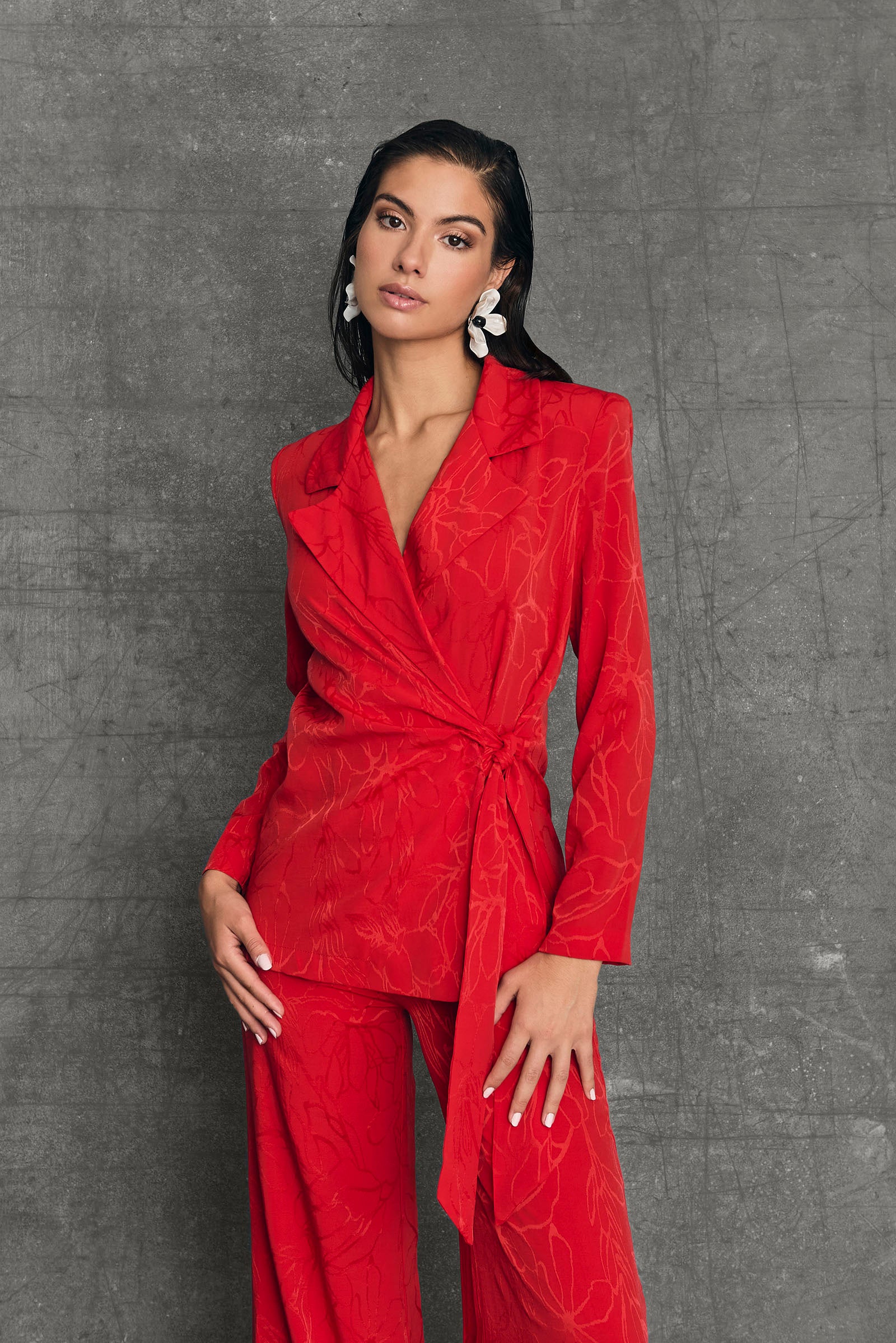 La blazer fluida resalta por su diseño cruzado con lazada lateral , que define la cintura, mientras que el cuello tipo esmoquin.
