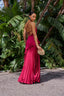 Vestido Dana Largo en gasa brillante con estampado acuarelado. Escote en V, espalda cruzada y volante Vestido Dana Largo en gasa brillante con estampado acuarelado. Escote en V, espalda cruzada y volante