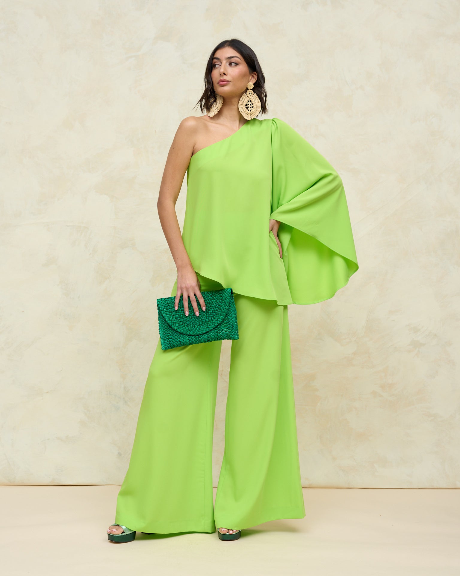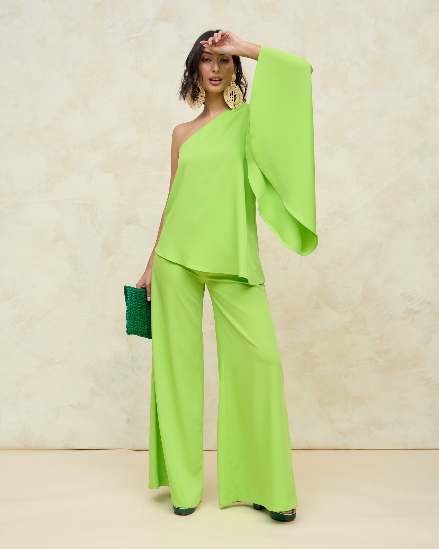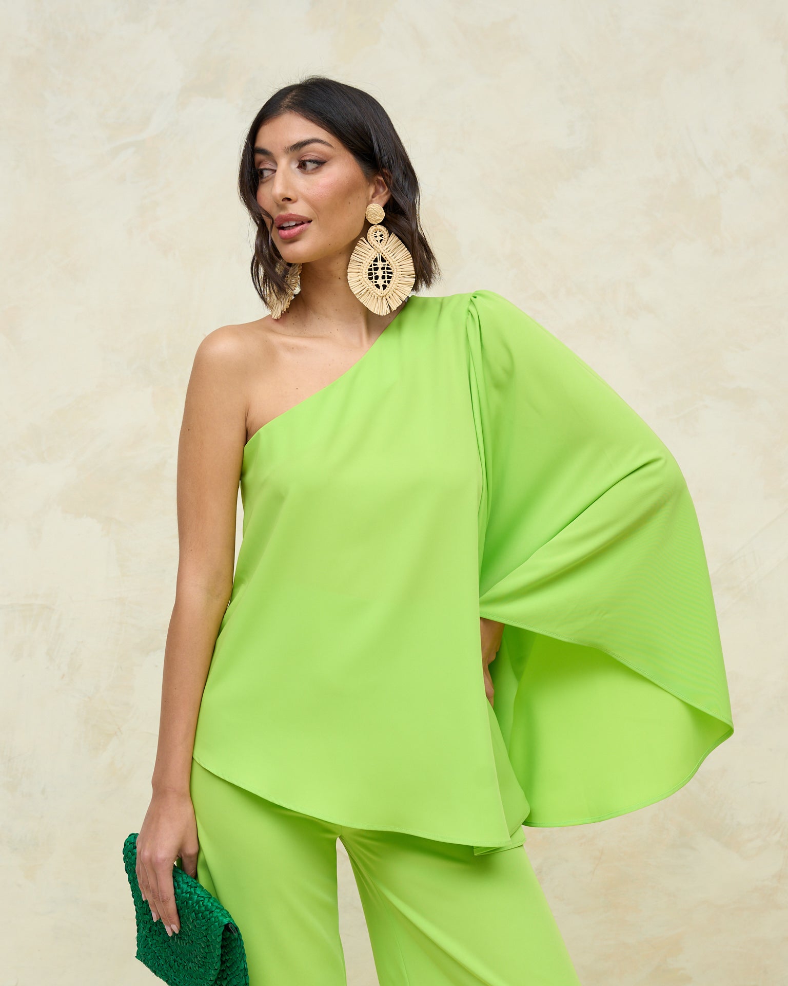 Suis Triana, une blouse asymétrique en crêpe lime et je ne laisserai personne indifférent. Aussi, mon design avec une seule manche évasée, Il mettra en valeur votre silhouette .