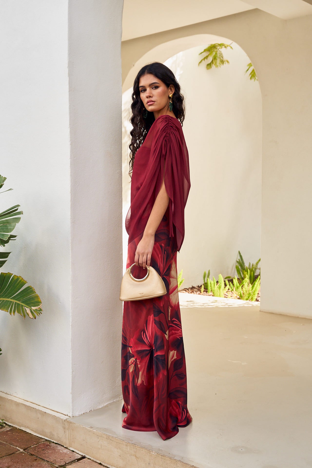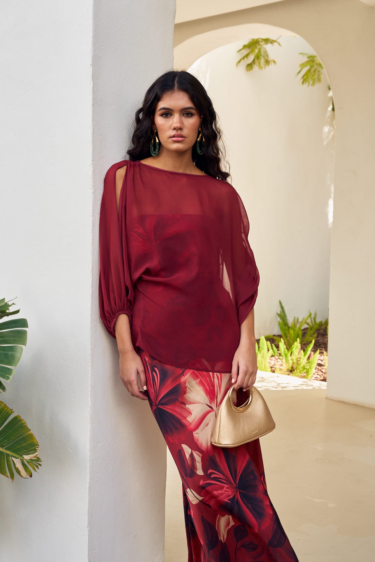 Nous vous présentons la Cape Duna en Rouge, confectionnée en mousseline. Cette cape asymétrique se distingue par sa manche bouffante avec élastique intégré pour un meilleur ajustement, son col bateau et ses fronces sur les épaules, donnant plus de corps à votre look.
