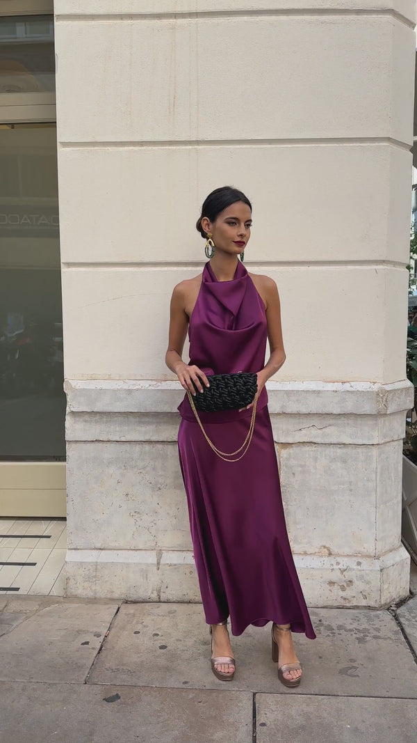 Nous vous présentons notre top halter en double satin de couleur Berenjena, conçu pour se démarquer lors de toute occasion spéciale.