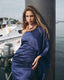 Découvrez notre superbe robe longue asymétrique Olalla en couleur bleu.