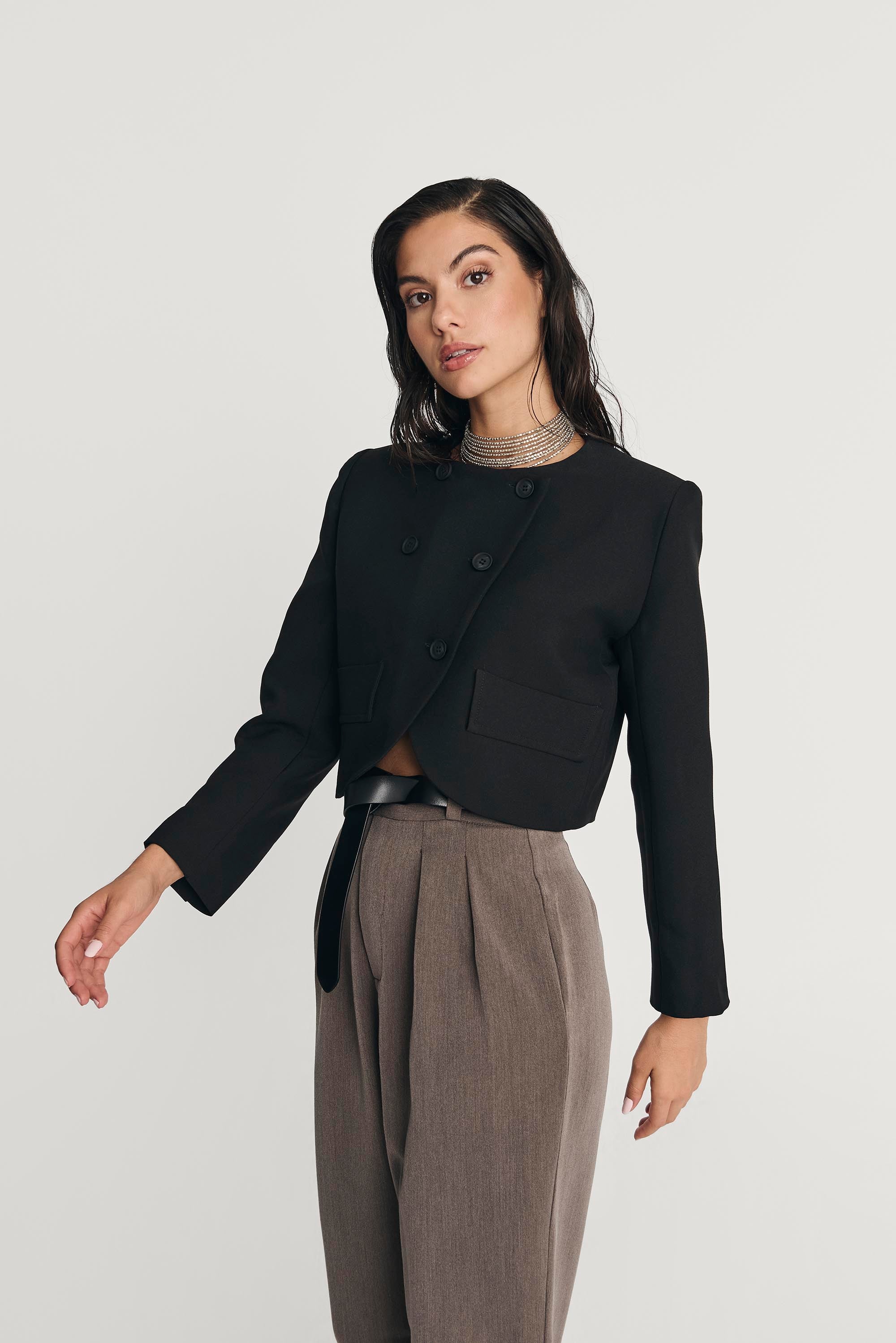 La veste boléro noire présente une coupe croisée avec des boutons stratégiquement disposés qui apportent une touche structurée et moderne au design.