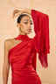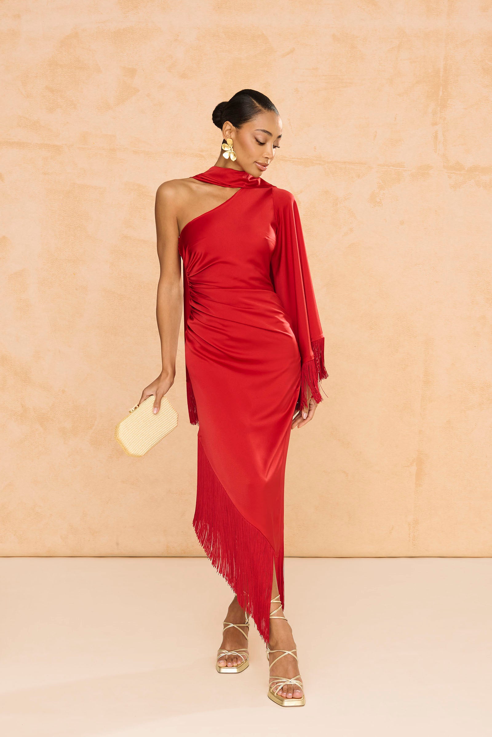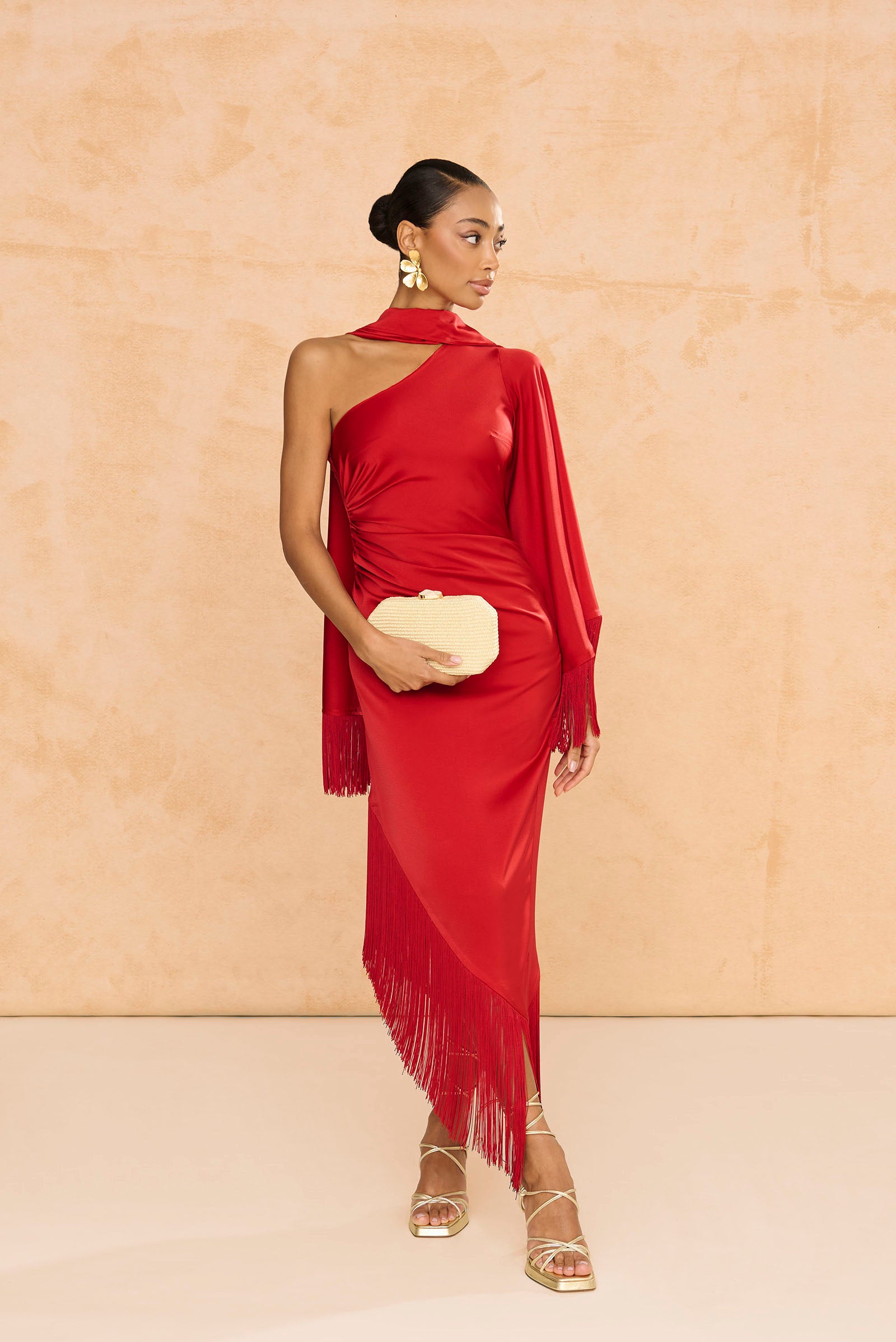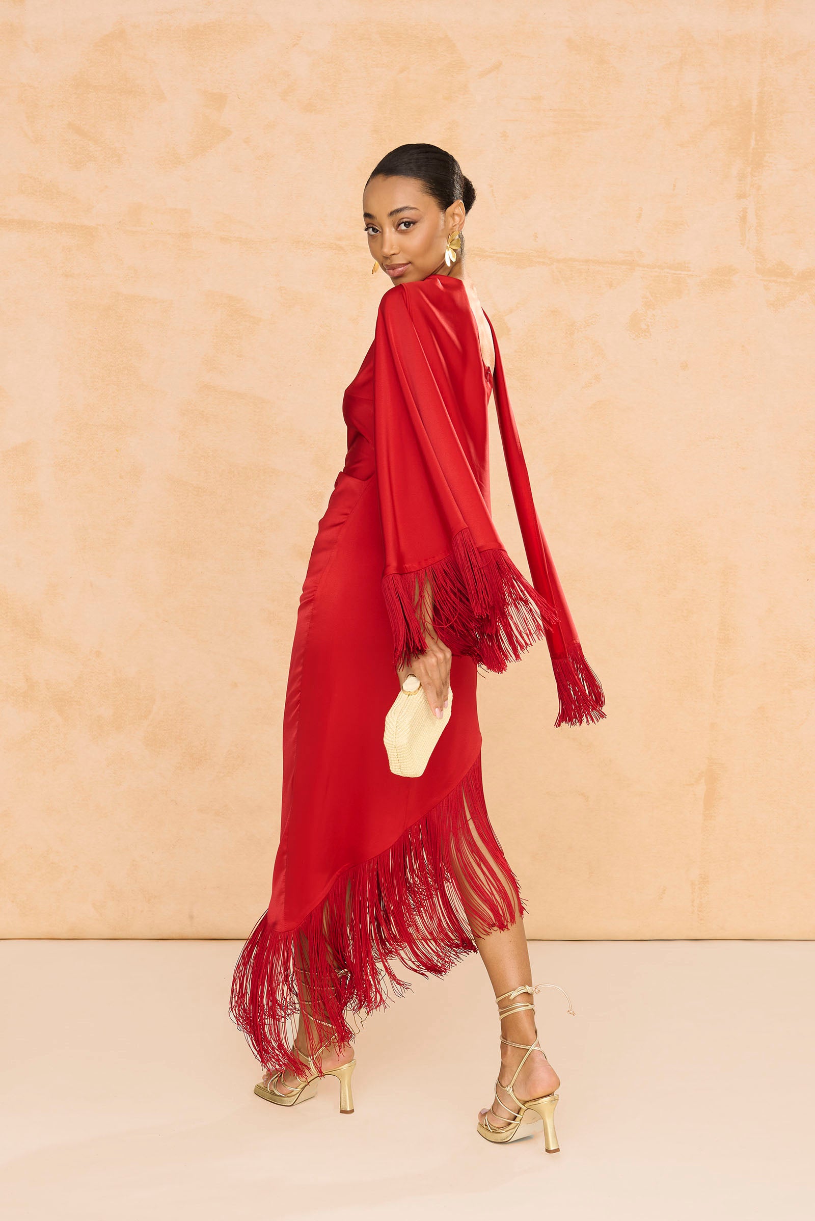 vestido Asimétrico Kenia Rojo, con flecos y chal,  drapeado lateral una manga
