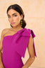 Ce modèle est réalisé en crêpe et se distingue par son grand nœud sur l'épaule . Le haut est de coupe asymétrique et la jupe est gainée d'une fente au dos.
