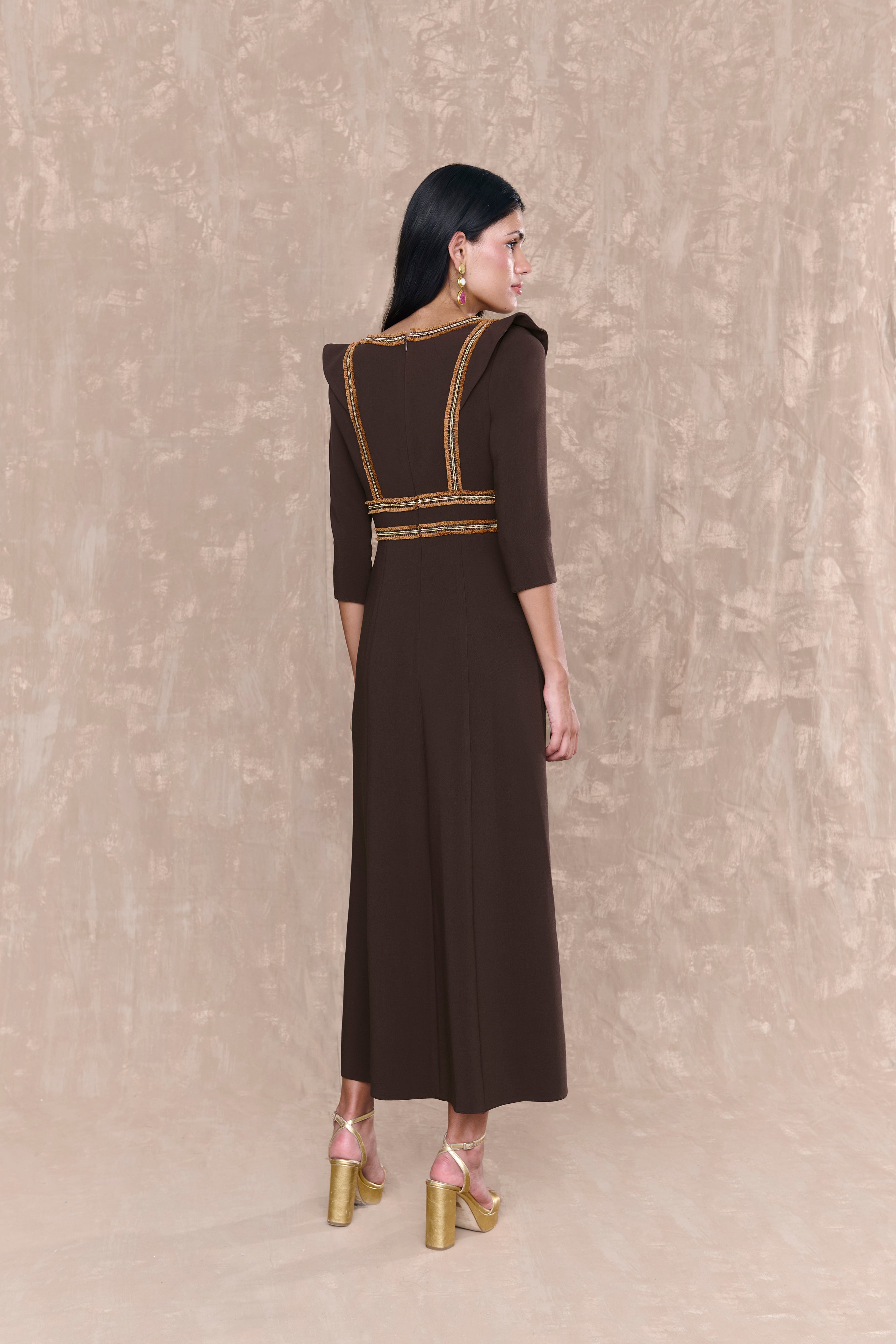 Notre robe midi Èlodie Marron se distingue par sa sophistication structurée et ses finitions soignées. Elle présente des manches 3/4 et un décolleté en V orné d' un galon décoratif dans les tons marron et doré , qui court également le long de la taille, de la poitrine et de la jupe, stylisant la silhouette verticalement.