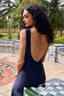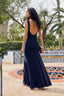 Découvrez notre Robe Longue Carmela, confectionnée en maille de soie bleu marine, un choix parfait pour briller lors de toute occasion spéciale.