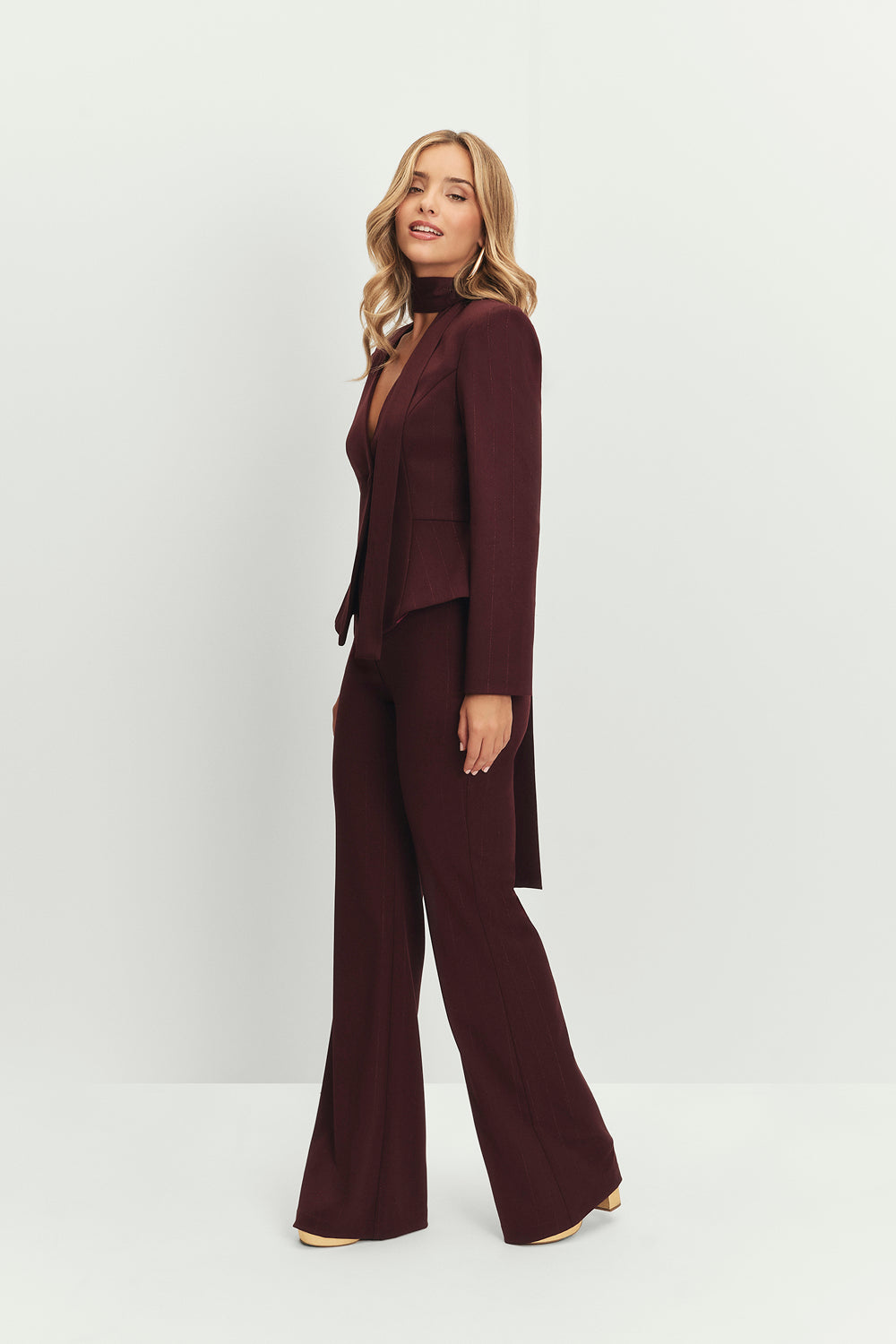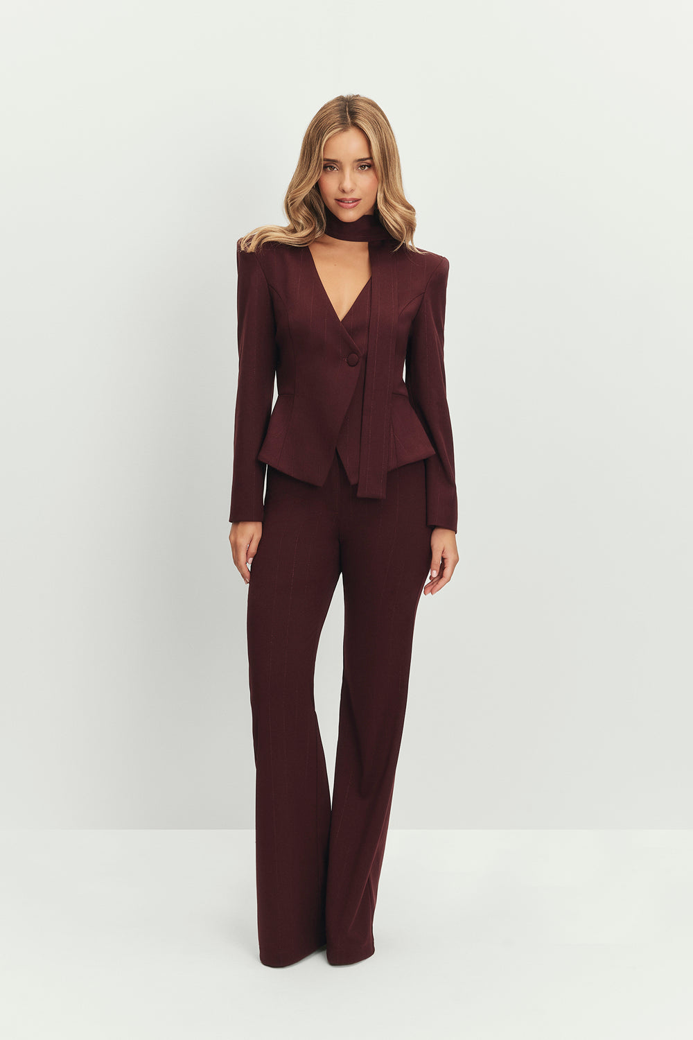 Su diseño arquitectónico se define por unas hombreras marcadas que estructuran los hombros y una cintura entallada con un sutil corte peplum, creando una favorecedora figura de reloj de arena. El profundo escote en V se realza con un elegantísimo detalle de choker a juego, que eleva la prenda a un nuevo nivel de exclusividad. Está confeccionada en un exquisito tejido de sastrería, salpicado por un sutil hilo de lúrex que le aporta un brillo discreto y glamuroso, y rematada con un cuidado forro interior a juego para un acabado perfecto.